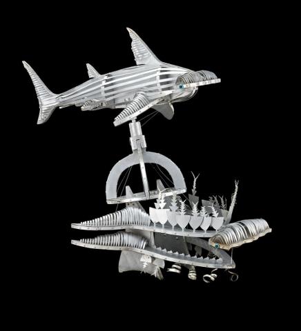 plywood, PVC, aluminium, enamel paint, rope and tigers eye shell opercula