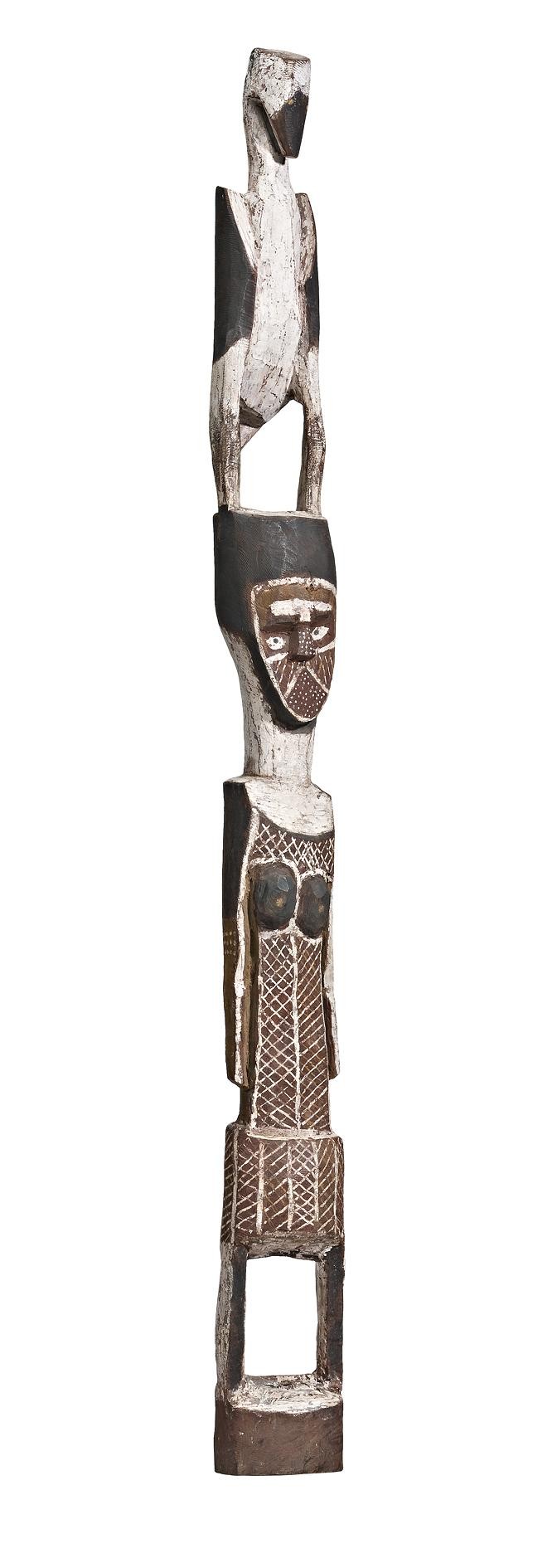 Painted, post–like figure sculptures are derived from the carved poles (tutini) made by the Tiwi on Bathurst and Melville Islands to surround the graves of the deceased in Pukumani or funerary ceremonies.