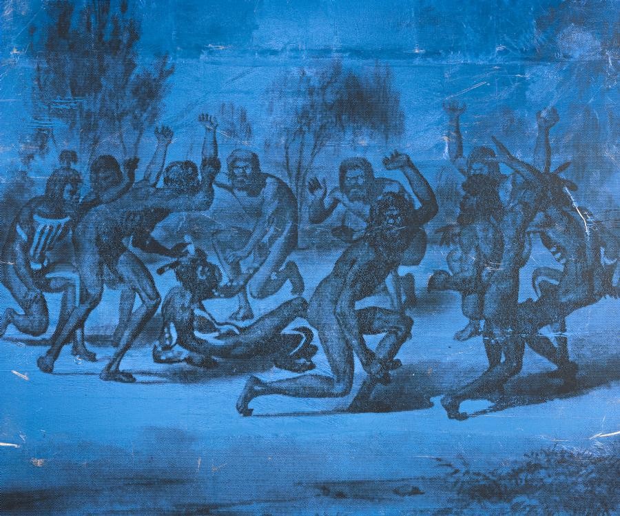 Here in The Island IV, Brook Andrew has transformed an image from Blandowski's Australien in 142 Photographischen Abbildungen, employing a screen printing technique involving coloured reflective foil on linen. The resulting work enmeshes lost or forgotten histories with contemporary ideologies. Traversing the fields of morality, cultural identity and perception, Brook Andrew revisits the humour and absurdity of these early imaginings.