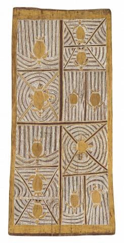 This work bears a label attached verso (distressed) which states in part: 'Jirgari, Mawalan, Sacred to the Riratiingo and Barangu groups. Situated between Elcho Island and Wessell Islands. Commencing at the corner – two green turtles are seen back to back. They are feeding off special seaweed and red line between them is a long rock. The diagonal red lines (are) channels of water through weed. The next picture shows two more turtles side by side with a rock between them. Hatching is again seaweed. The next picture shows two turtles caught in a whirlpool and carried to the bottom. In his dreaming, the (artist) sees springs of fresh water running into the whirlpool, and belonging (to) his group and the others belonging to Barangu. The end picture again shows two turtles side by side, feeding with a reef between them. The curved hatching in front of them is an extension of the reef… The next picture (shows) turtles swimming with seaweed caught around his neck. Hatching (is) seaweed. The next picture shows two of the largest turtles of the green variety caught in a whirlpool. They are being thrown around on top of the water. The diagonal (hatching is) again streams of water, two belonging to Jambabungi, one Riratjiingo, (and one) Barangu.'