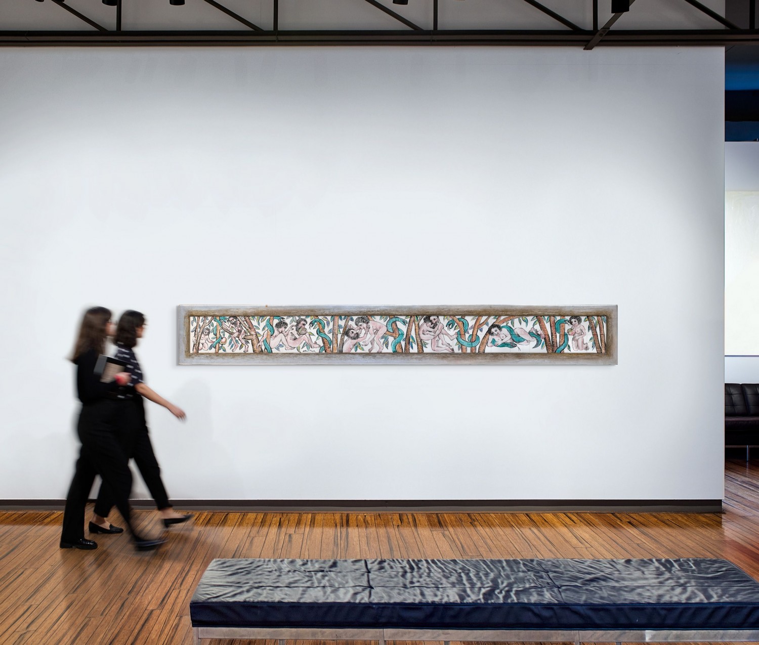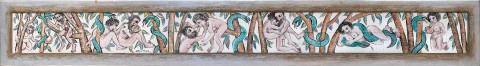In Adam and Eve, Boyd employs the serpent as a unifying motif that also punctuates the events. The figure of Eve is based on Betty Burstall, identifiable by her curly black hair. Her presence links the frieze to Boyd’s earlier painting The expulsion, 1947 – 48 (Art Gallery of New South Wales), painted in a fury after she had conducted an adulterous affair with Perceval. Adam, however, is based on imagination, a wild and hirsute man who is initially shown living in harmony in the Garden before the serpent’s intervention. His emotions then erupt, first in violence then with desire, before ending with Eve firmly within the snake’s embrace. Boyd’s fluidity with the brush is exemplary and the narrative is further energised by ‘a dominant pictorial rhythm, (with) a strong telling and pervading gesture.’4