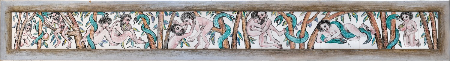 The career of Arthur Boyd is distinguished by his mastery across media, be it painting, drawing, printmaking or ceramics. The son of Australia’s first studio potter Merric Boyd, Arthur learnt first by example, then through his own experimentation on his father’s equipment at the family compound known as ‘Open Country.’ In 1944, he formed his own business, AMB Pottery, in partnership with his brother-in-law John Perceval and their colleague Peter Herbst. Sited in a former butcher’s shop in Neerim Road, Murrumbeena, the pottery utilised some of Merric’s old machinery bolstered by a new gas kiln, stillage and electric wheel. The immediate aim was mass manufacture of utilitarian crockery to meet the demand caused by wartime shortages but once released from these restrictions, they set about making earthenware to their own design with under-glaze painted decorations featuring flowers, animals and joyous, boisterous scenes. Concurrently, Boyd was also painting significant works such as The Mockers (Art Gallery of New South Wales) and The Mourners (private collection), both from 1945, based on biblical stories inspired in part by his grandmother’s practice of reading aloud ‘from an illustrated bible, the tinted engravings in the text being as marvellous as they were bizarre, often even gruesome.’1 The frieze Adam and Eve, 1950 – 52, reflects all of these sources.
