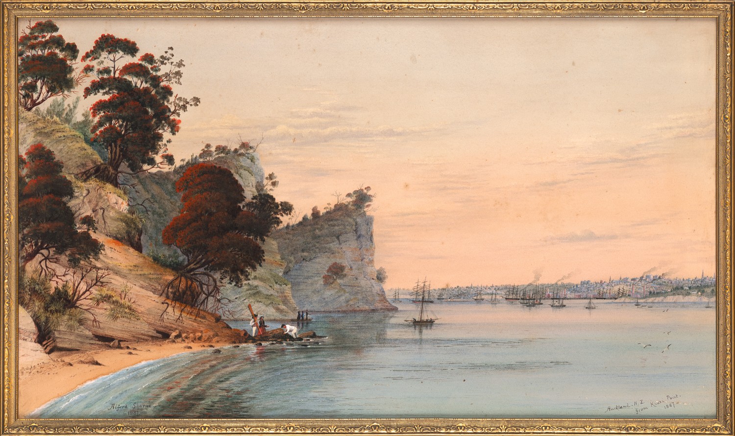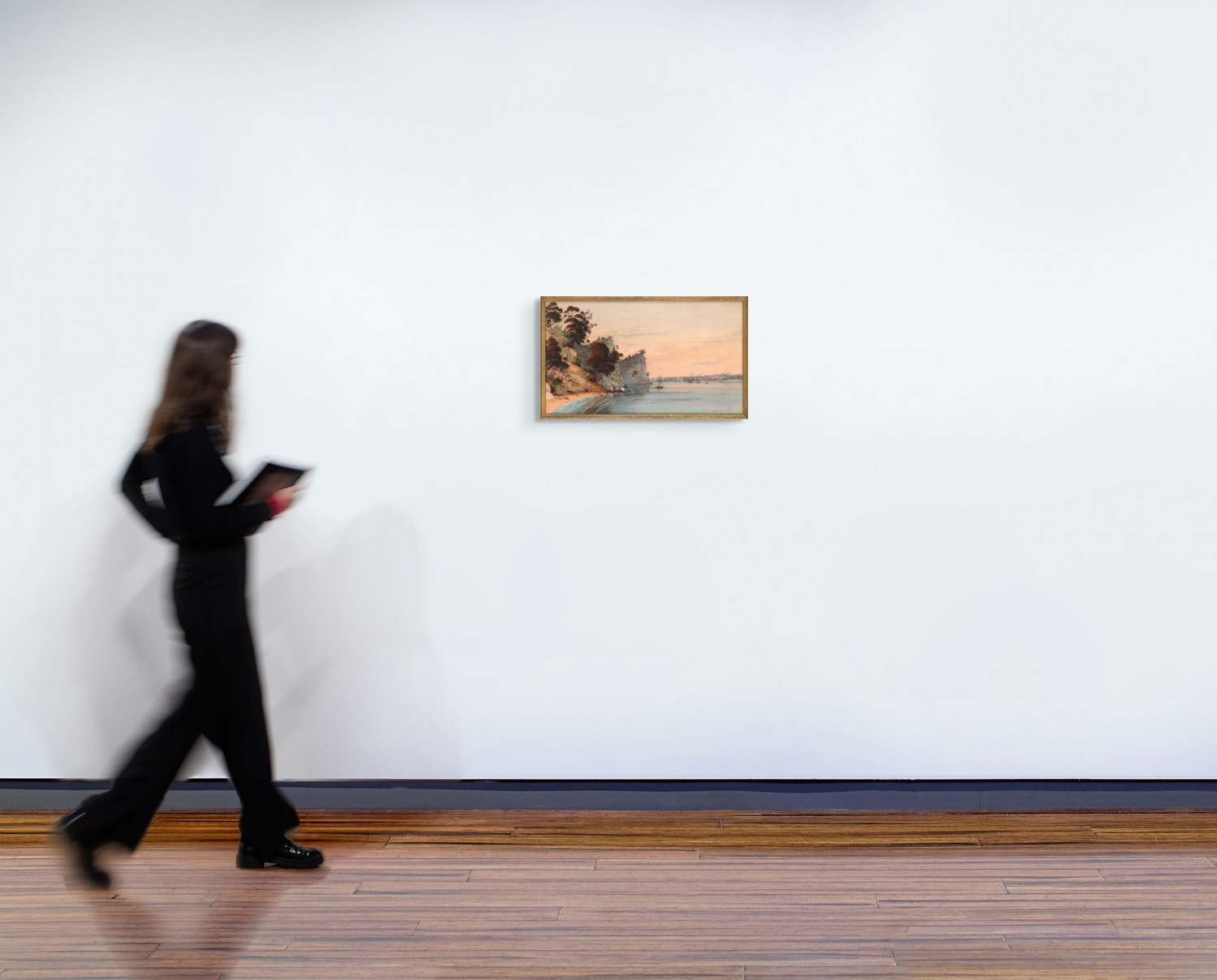 Painted shortly after Sharpe’s departure from Auckland in 1887, Auckland, New Zealand – from Kauri Point, 1887 represents the culmination of his luminous mature style. Having relocated to Newcastle, New South Wales, following personal and professional disappointments, Sharpe continued to rework sketches brought from New Zealand into ambitious finished watercolours. In the present composition, his meticulously layered washes and heightened chromatic sensibility are brought to their fullest expression, with the atmospheric brilliance of the sky – likely inflected by the extraordinary sunsets witnessed globally after the 1883 eruption of Krakatoa – suffusing the harbour with an almost visionary radiance. Structured around a striking contrast between the rugged, tree-clad cliffs of Kauri Point in the foreground and the encroaching colonial settlement across the distant shoreline (where clustered masts and architecture signal Auckland’s expansion), Sharpe highlights the tension between untouched landscape and increasing urban presence – thus subtly articulating his awareness of colonial transformation and loss.