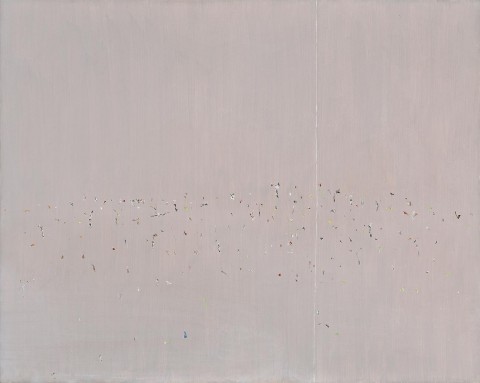 Masterful works followed, including Landscape ’69 triptych, 1969 – 70 (National Gallery of Australia, Canberra), where a few deftly painted trees and fallen branches dance lightly across a grey ground, as Williams pared back pictorial and painterly detail. Patrick McCaughey has noted that until 1968 Williams was intent on developing his own visual language, but with strong foundations of formal invention and solid craftsmanship, as well as professional acknowledgement and some commercial success, by this time he had the confidence to experiment and absorb elements of contemporary painting into his own practice.3 The influence of Minimalism and late 1960s abstraction, styles of art that focussed on the conceptual and aesthetic rather than recognisable subject matter, is clearly evident in the paintings of these years. As the current Australian Landscape, 1969 shows, the works that came next were even more refined – open fields of virtually unmodulated colour (typically cool greys or various shades of ochre), sometimes divided, as we see here, by one or two fine vertical lines of exposed canvas, with a series of delicately painted marks like personal hieroglyphics, which suggest various landscape forms. Serenely minimal from a distance, this work defies such easy categorisation upon close inspection as colour shimmers across the surface, finely variegated brushstrokes defining the gentle outline of a hill and creating a sense of three-dimensional space. While Williams removed many of the traditional elements of the genre from his Australian Landscape images, they nevertheless retain a strong feeling of their subject, so much so that the experience of being in the landscape often mirrors that of viewing his paintings: ‘in the bush, where the peering eyes move from the veins of a leaf to the colour of a pebble, to the curl of a fern, to the discreet glint of a modest flower – so in Williams’ paintings does the eye probe among the touches and discover its lode of visual treasures’.4