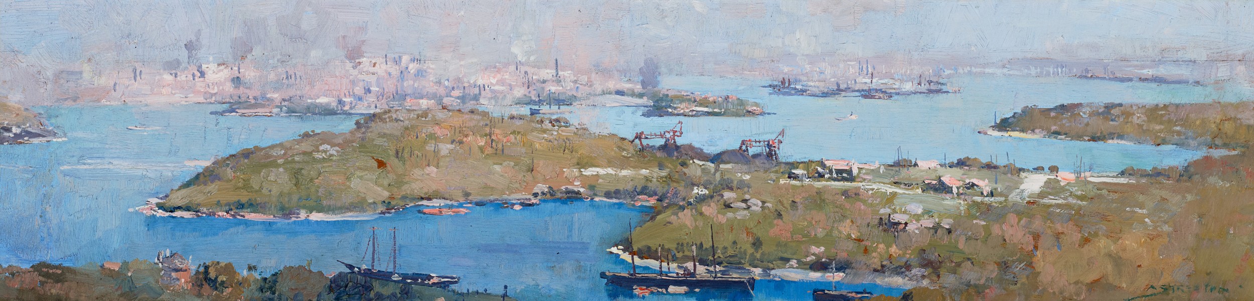 The outlook from the tower, 27 meters above ground, afforded Streeton a spectacular view of Sydney, taking in its distinctive geography and the sinuous juxtaposition of land and sea, looking across Berry’s Bay in the foreground, towards Balls Head reserve and Waverton, with Leichhardt in the distance. Combining a wide panoramic view with carefully painted details of boats in the water and gantries, the painting adopts the wide format of earlier views such as Circular Quay, 1893 and At Coogee, 1895 (both in the collection of the National Gallery of Victoria) which emphasised the horizon line and were sometimes painted on draper’s boards.8 Streeton showed a selection of the paintings made in Sydney in his 1921 exhibition at the Athenaeum Hall in Melbourne, which was alliteratively titled Streeton’s Show of the Sunlit Suburbs of Sydney. The Argus critic was full of praise, highlighting his ability to convincingly depict great distances and writing that ‘Mr. Streeton is noted for his rendering of [Sydney Harbour], and he presents a series of panoramic views well up to the standard of beauty that he has set himself to achieve. What he puts down is full of great charm of colour, handled with masterly ease.’9 Drawing particular comment, this painting was described as an ‘atmospheric study [in which]… these qualities of colour and facile brushwork are given full play with admirable results.’10