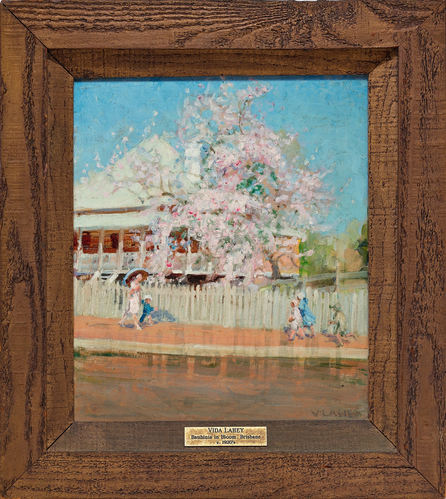 Vida Lahey’s Bauhinia in bloom, Brisbane, 1929, shows a scene located on Gregory Terrace in Brisbane, a long stretch of road facing parklands.1 In the 1920s and 1930s, the Terrace was home to numbers of the now-iconic raised ‘Queenslander’ houses similar to the one pictured here. The precinct was also home to the Exhibition Building and Concert Hall, built 1891, which housed a modest art gallery to which Lahey was closely connected. Indeed, in 1931, when a new gallery was built within the former Concert Hall, Lahey and her close friend and colleague, the sculptor Daphne Mayo, were honoured by having key examples of their work placed at the entrance, ‘a remarkable testament to the high standing these women had won.’2 In Lahey’s case, it was her powerful and immensely popular painting Monday morning, 1912 (Queensland Art Gallery I Gallery of Modern Art, Brisbane), an honest appraisal of her sister and another woman at work in the family laundry. Lahey was the eldest of twelve children but shared her younger brother Romeo’s ‘interests in planning and environmental issues. In the 1920s and early 1930s, (she) painted as many scenes of industry and civic construction as women in social, work and leisure settings. Both men and women display the dignity of labour and service.’3 Whilst Monday morning illuminated domestic labour, the focus of Bauhinia in bloom, Brisbane is the flipside – a relaxed outdoor stroll with young children.