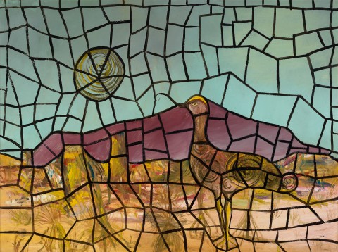 In 1948, shortly after marrying Cynthia Hansen (née Reed) and settling in Sydney, Nolan set off again with his new family on a remarkable journey to some of the most remote parts of the continent, following Eddie Connellan’s mail-service route through Alice Springs. Cynthia Nolan wrote in her travel notebook that Nolan ‘was both tremendously excited and repelled by the wind, desolation and phenomenal light… Enlivened by his own vision, painting executed with fiery speed, savage scrubbing, tender delicacy and penetrating wit.’2 Here, the sunbaked earth of central Australia, its cracked tessellations overlaying the entire image, surprisingly supports flourishing flora and fauna. The unexpected patterning fracturing this scene shares the ink and enamel transparency of Nolan’s contemporaneous paintings on glass, as well as the austere gridded abstractions of his earliest artworks in 1939. Painted beneath in glossy Ripolin, the continent’s interior of purple cratered peaks, scrubby bush, and a hypnotic spiral sun hanging in a blue sky, is presented as a shimmering primordial landscape.