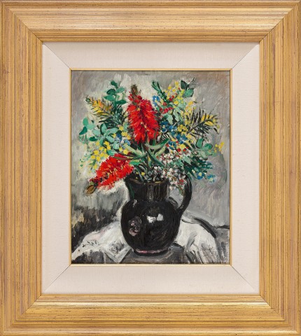 The blooms in Bottlebrush are bottlebrush, wattle, yellow pea, and Dampiera (fan flower), and since these all favour Spring to early Summer for their flowers, the painting was likely begun late in 1951 but completed in the first months of 1952 before exhibition at the Macquarie Galleries-affiliated Finney’s Gallery, Brisbane, in July. Throughout her career, Preston was often dismissed by critics due to her gender and, as Art Gallery of New South Wales director, Hal Missingham, noted upon her death that ‘if Margaret Preston had been a man, I feel sure she would have enjoyed a public reputation equally as great as Dobell, Drysdale or Nolan.’3 Time has eased this view of the status quo, and Preston is now rightly regarded – and loved – for the strength, vigour and intelligence of her art.