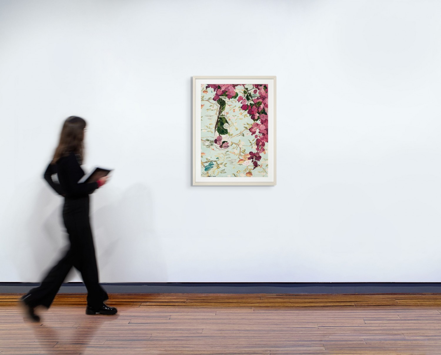 Bursting from a sturdy wine decanter which wouldn’t be out of place serving house red in a Greek beachside taverna, the decorative profusion of the bougainvillea cannot be contained by the edges of the Campbell’s plywood block. In addition to the mottled texture of the printed watercolour paint happily evoking the plant’s distinctive papery blooms, the artist acknowledges the passing of time with subtle differences of colour. The wide range of red and pink hues conveys blooms past their prime on the desiccated tip of the branch and fallen into the water in the carafe, leached of their vibrancy.