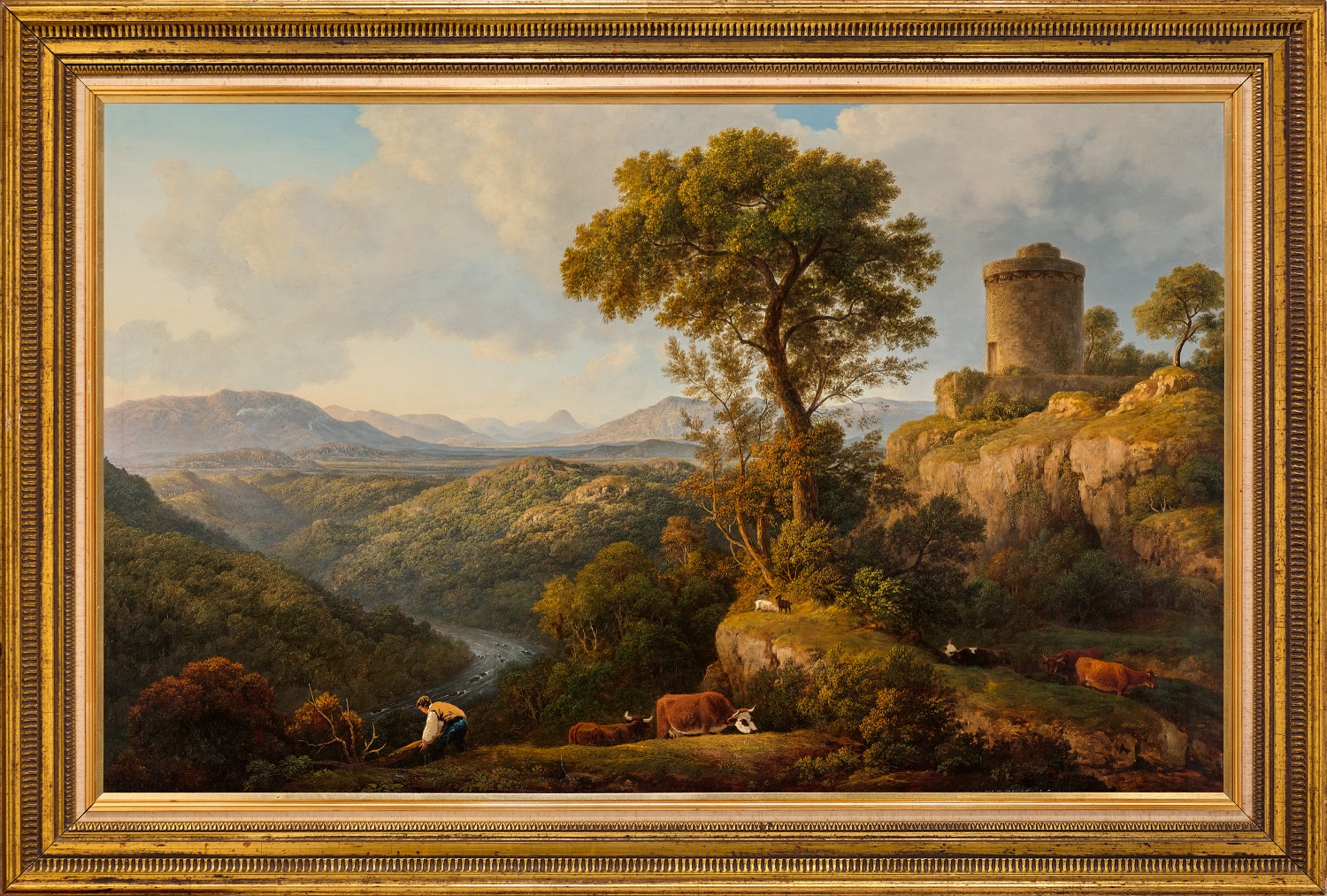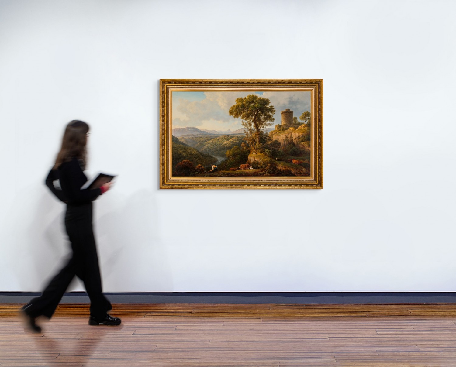 The present expansive scene is typical of Glover’s output, combining the key elements described by Carey. A heavily wooded valley stretches to the distant sun-tipped mountains, our eyes directed to the curving river and beyond by the bending figure’s light clothing. In the foreground, cattle and goats gently animate the scene, grazing contentedly, immersed in the folds of the rocky hilltop. The well-preserved stone fortification that overlooks the valley may be a medieval round tower seen during Glover’s travels, among the innumerable castles, churches, classical buildings and ruins that he sketched. Alternatively, it might be an imaginary feature, a compositional device inspired by classical edifices in the seventeenth-century art of Nicolas Poussin and Claude Lorrain whose luminous arcadian tranquillity Glover sought to emulate. His Classical landscape (Art Gallery of New South Wales), identified by David Hansen as Landscape with a Sybil’s temple: Composition, and painted the year before Glover first visited Italy, has a comparable tower in the mid-distance.