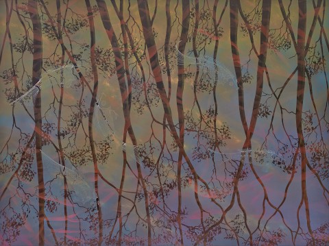 From a series of 1993 paintings titled 24 hours at Numerili, recording the same site at different times of the day, Dawn at Numerili, is a striking example of Onus’ multilingual visual language. Painted after an annual journey to visit Wunuwun at Gamardi, this work depicts the interplay between Aboriginal and non-Aboriginal visual languages. Here are photo-realistic images of a billabong, where reflected tall trees emerge in the dawn light and five fish glide just below the surface of the water, affording glimpses of the traditional markings that cover their bodies. Details such as these convey the sense that the artist spent hours observing this setting.