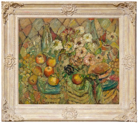 Janda Gooding has observed that O’Connor’s contribution to the 1921 Salon d’Automne ‘[marked] a transition from the figurative paintings, preoccupied with painterly concerns and impressions of a fleeting moment, towards a commitment to explore the still life.’3 With its focus on familiar domestic objects, this genre became a strong theme in her art and ‘the table top became the site for her explorations of modernism.’4 Painted in 1947, Domestic scene is characteristic of O’Connor’s approach, depicting a complex grouping of flowers, fruit, glass bottles and vessels so densely arranged that the surface beneath them is barely visible. We see glimpses of the harlequin pattern that forms the backdrop to the image however and a similar fabric appears in Australian riches, c.1949 – 51 (Art Gallery of Western Australia) and the earlier painting, Between hours, c.1928 – 30 (Queensland Art Gallery I Gallery of Modern Art), a reflection of O’Connor’s interest in pattern and ornament, as well as a nod to her work as a textile designer in Paris and Sydney during the 1920s. Pictorial space is tightly compressed and the prominent texture of the brushstrokes, expressive and energetic, reflects the pleasure O’Connor found in the process of painting and in her medium, as well as the assured way in which she manipulated it across the canvas to create images which are intimate, aesthetically rich and atmospheric.