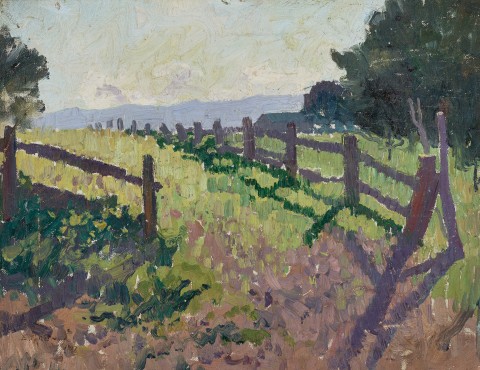Field, 1917 was executed en plein air at a farm owned by James Innes at Emu Plains, near the Nepean River on the lands of the Darug people. Set on ‘rising land in the shadow of the Blue Mountains’,1 Gruner stayed on the property in a small hut, sleeping on its floor, ‘wrapped up in chaff bags to keep the chill out of his blood, (and watching) for those clear, colourless dawns to arrive, with a palette set to a key that would paint the unpaintable, light itself.’2 In a letter to Hans Heysen in 1918, Gruner exclaimed that ‘I simply must work on the spot or be absolutely in touch with it.’3