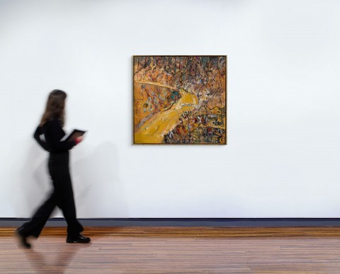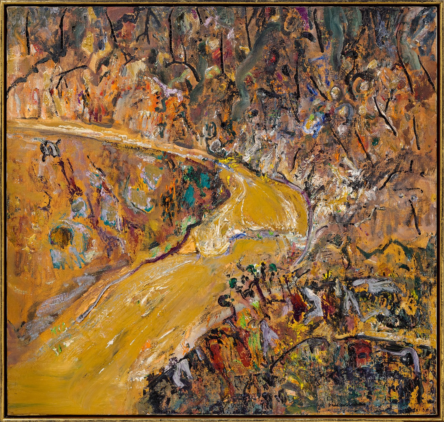 To accomplish his ambitions, Williams, who had never learned to drive, initiated a weekly ritual whereby a fellow artist, beginning with John Perceval, would pick him up on a Wednesday and travel to the bush before setting up their easels ‘rain, sun or cold… [painting] feverishly for six hours.’4 In a newspaper interview, Williams said: ‘I accept any spot as a challenge. I find a trigger in the landscape for what I want to do.’5 The canvases would then be reworked wet-on-wet in the studio. Although the locations were usually non-heroic or epic, Williams was by 1976 increasingly attracted to gorges and waterfalls, ‘drawn to an elemental landscape where forces, which shaped the land, could be observed and painted.’6 These developed into what is now known as the ‘Gorge series’ of 1976 – 77, and Flooded creek, 1977, is one of his last responses to the motif before beginning a commission from Comalco Ltd to paint the Weipa district in far-north Queensland. It appears to be a companion to such works as Dry creek bed, Werribee Gorge I (Tate Gallery, London) and The river, Werribee Gorge (Art Gallery of New South Wales), both painted the same year, and is a vivid response to the raging torrent of water engorged by recent rains. A number of the ‘Gorge series’ paintings feature sharply angled bends, described by Patrick McCaughey as ‘the great-angle hooks (whose) wiry, irregular black line uncurves [sic] like a whiplash across the painting.’7 In Dry creek bed, Werribee Gorge I, an ancient creek bed lies exposed, deeply etched into the surface of the land. Although the landscape appears parched, Williams conveys a sense of renewal with signs of life seen in the scatter of plants around the creek bed. Flooded creek may well be from a similar location in Werribee Gorge, likely driven there by artist Fraser Fair – only now the vegetation blooms in response to the sudden amount of water.