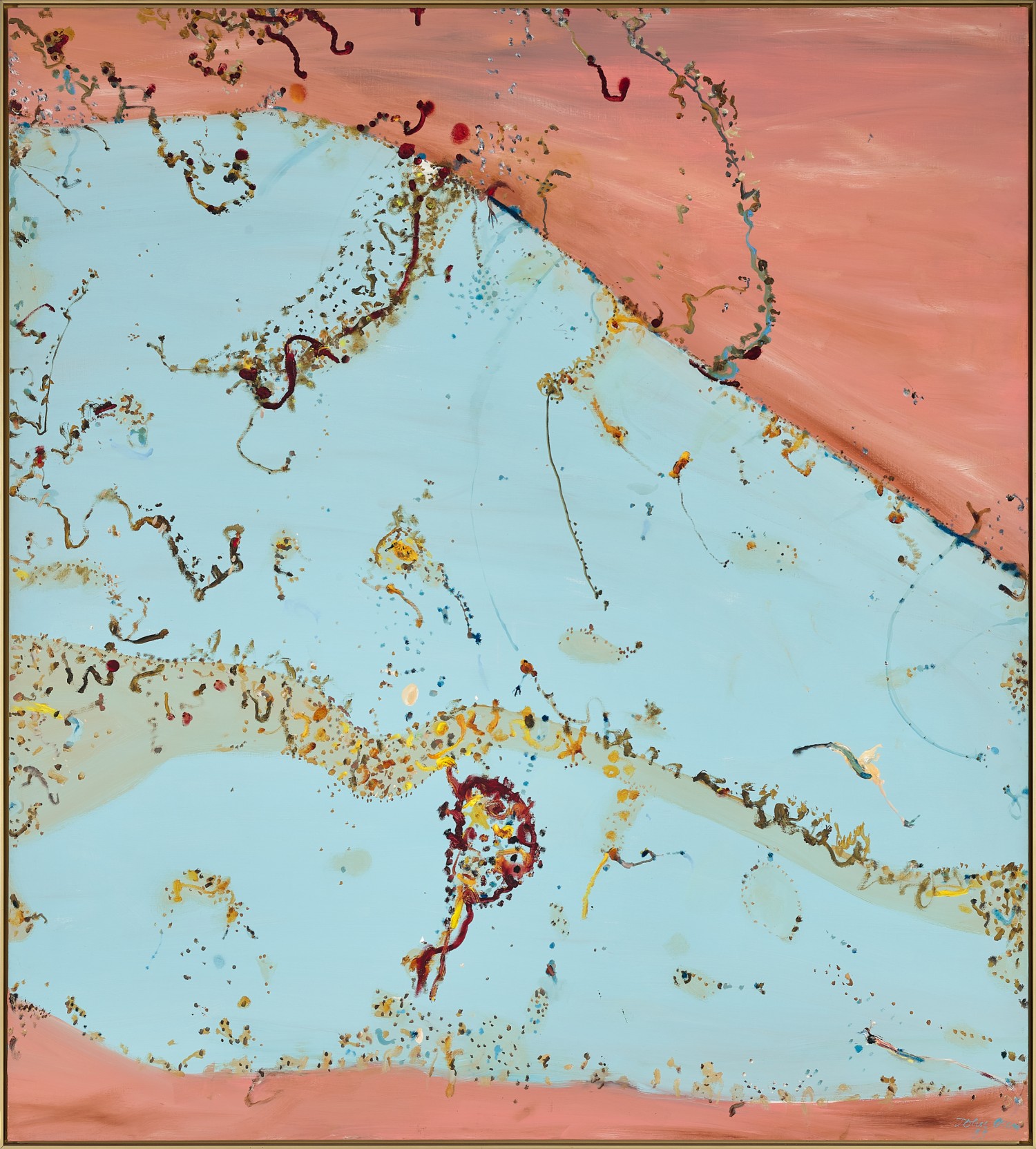 Between August 1982 and April 1983, John Olsen travelled extensively through the northern reaches of Western Australia as part of a project commissioned by the Christensen Fund in Perth which resulted in the lavish book Land beyond time.1 Described as a journey of ‘modern exploration of Australia’s North-West frontiers’2, Olsen’s companions included authors Geoffrey Dutton and Mary Durack, and naturalist Vincent Serventy. Halfway through the project unseasonal rains filled Lake Gregory (Paraku), an otherwise brackish body of water situated between the Great Sandy and the Tanami deserts. The flooding spurred memories for Serventy and Olsen who had previously visited Lake Eyre (Kati Thanda) together in 1974 when it too overflowed and brought life back to the desert. For Olsen, who had already spent many years studying Buddhist and Zen texts, this ephemeral experience of ‘fullness out of emptiness’ perfectly fitted his understanding of their principles. Flooded river, Kimberley, 1983, shows the artist expressing this sentiment with the swollen waters of the lake forming a vast central bowl that teems with life whilst sending tendrils of growth into the otherwise sparse red dirt beyond.