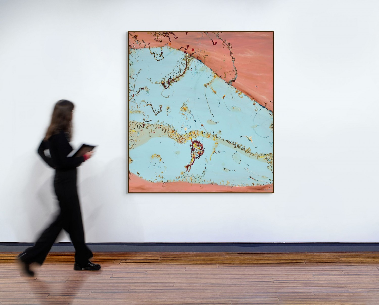 Olsen encountered Lake Gregory during a small plane flight in April 1983 with Dutton describing ‘the great muddy invasion of the red and yellow land… Roads and a riverbed disappeared into the edge of the lake, with only the trees along the riverbanks showing above the waters that flooded into the lake.’3 On landing, the manager of the nearby Aboriginal settlement and cattle station took the party on a boat ride ‘down the flooded river between the trees’ before returning to the community ‘under tall coolabah trees where hundreds of darters were nesting, the chicks wobbling in agitation in the shallow nests.’4 The art critic Robert Hughes once wrote of Olsen’s ability to use his mind ‘as a sieve, catching a complex load of emotions and associations… the picture seems to grow from his brush as naturally and directly as a twig from a branch,’5 and in Flooded river, Kimberley, it is possible to trace Olsen’s painterly journey as he follows the flights of the many thousands of birds whilst they chase insects and fish. Completed at his home studio in Clarendon, South Australia, Flooded river, Kimberley, is full of the artist’s signature calligraphic brush marks, bustling from here to there as they seek to capture this short-lived episode of life.
