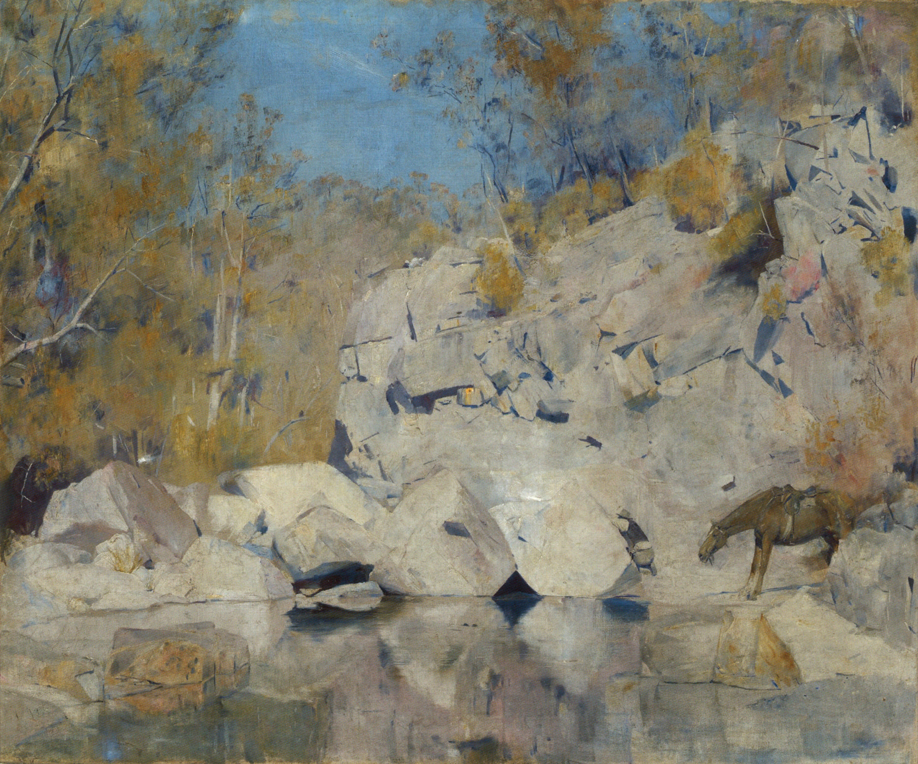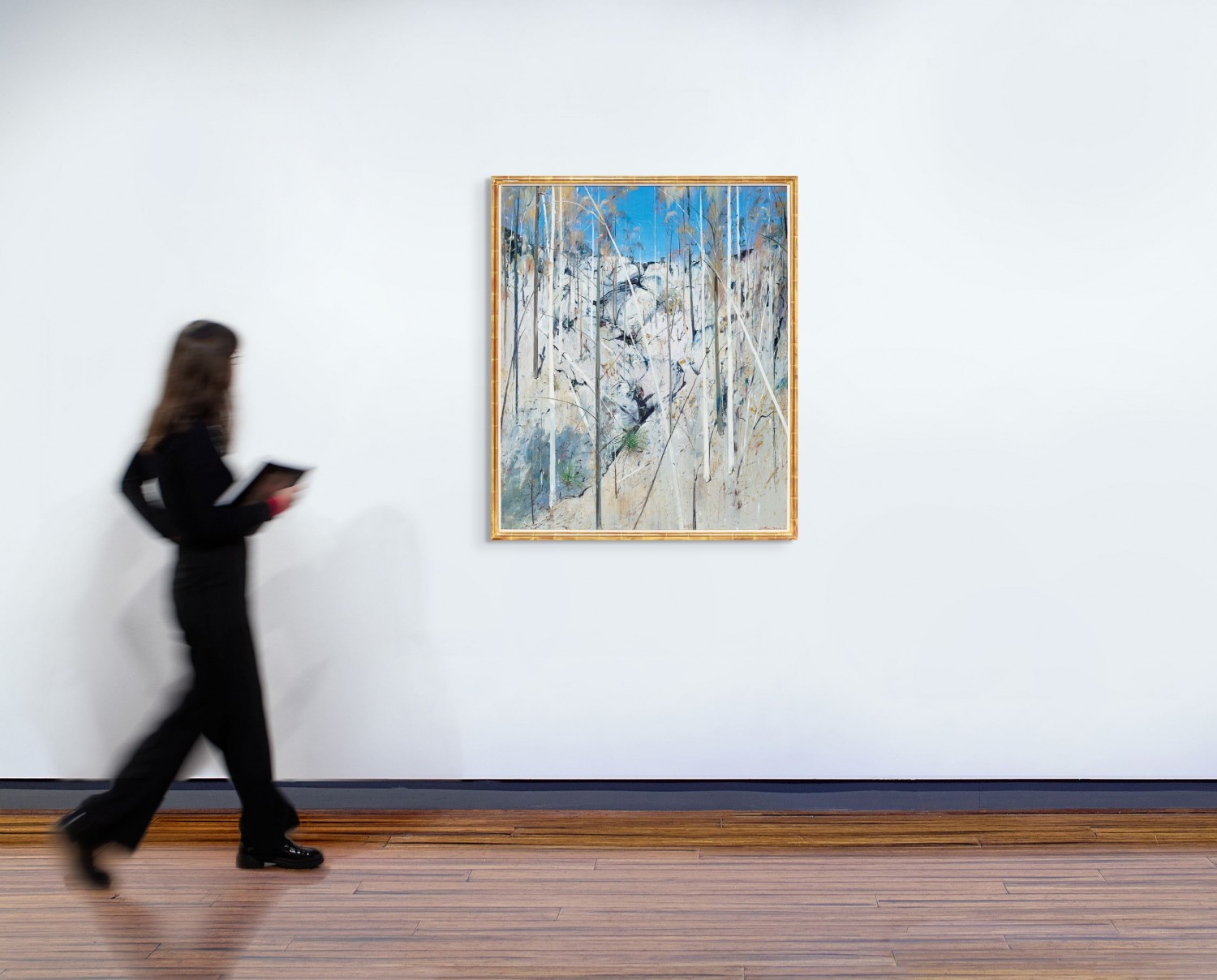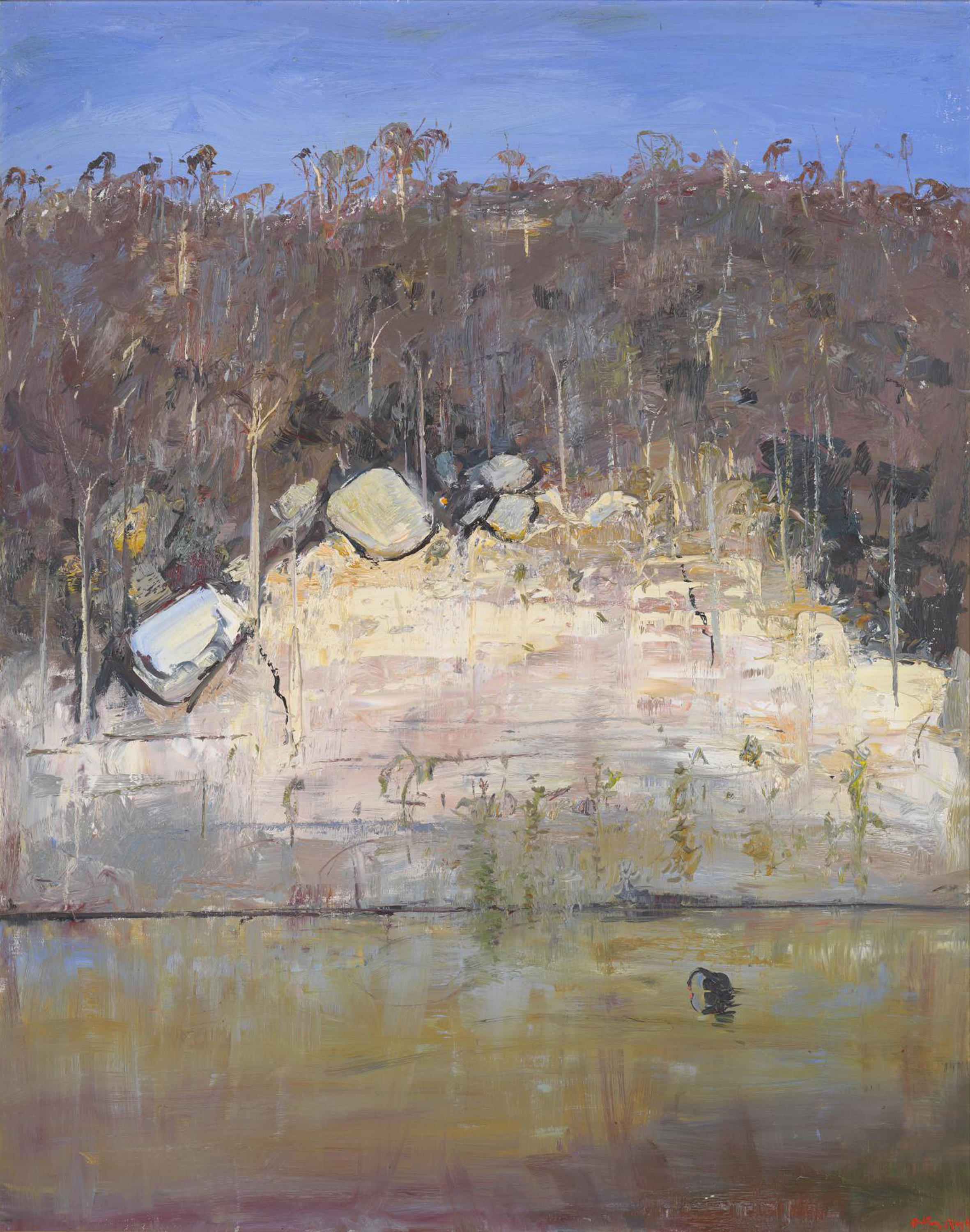 Wild and primordial, the region differed completely from the ordered English countryside to which he had grown accustomed and thus, a new vision was required to unlock its tangled mysteries. If previously Breughel and Rembrandt had offered inspiration, now Von Guérard, Piguenit and Buvelot became Boyd’s spiritual mentors. Yet at times, as McGrath notes, he also could not ‘resist the temptation to paint the landscape in the manner of the early Box Hill painters’3 – as witnessed by the present Hillside (Shoalhaven), c.1975 which evokes strong affinities with masterpieces of Heidelberg Impressionism such as Tom Roberts’ In a corner on the Macintyre, 1895 (National Gallery of Australia), both works featuring the motif of majestic sandstone cliffs standing timelessly in the scorching sun to convey the unique stillness, light and poetry of the Australian bush.