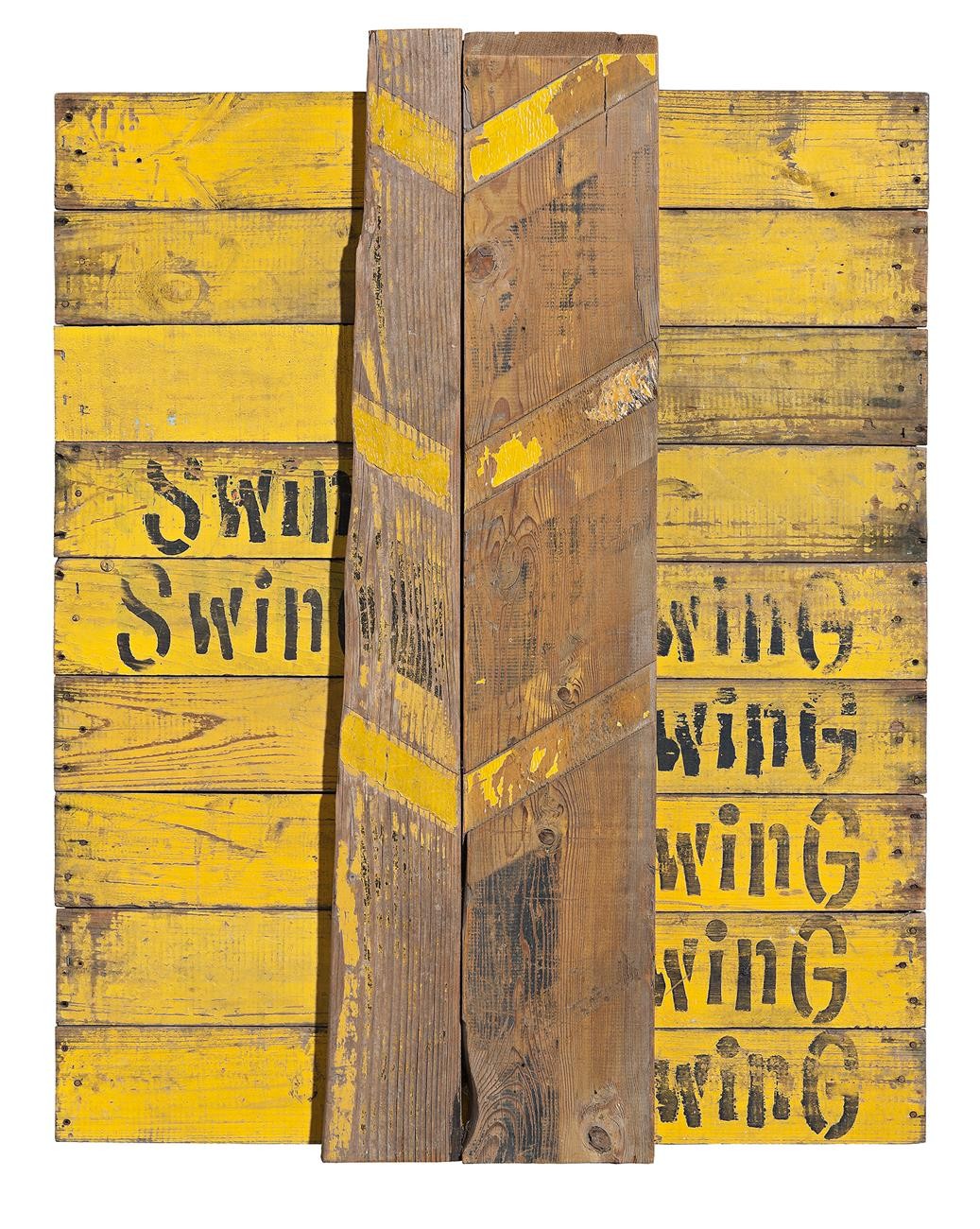 The materials – signboards for soft drink boxes and two street barricades – came out of Gascoigne’s past work and would lead into the work to come. Here she literally unpacks the boxes that had formed the frame and foundation of her earliest assemblages from the 1970s onwards.2 The work's tripartite organisation is columnar – a form that ran through her art from first to last (people always talk about the grid but I think she favoured the column3). The dismantled box-boards are arranged like ladders, some with lettering that is a visual riff of short repeated words, ‘swing’ and ‘wing’, reminiscent of a refrain in music. Finally, and decisively, she ran two bold lengths of retro-reflective road barricade down the centre: the retro-reflective a sign of things to come.4