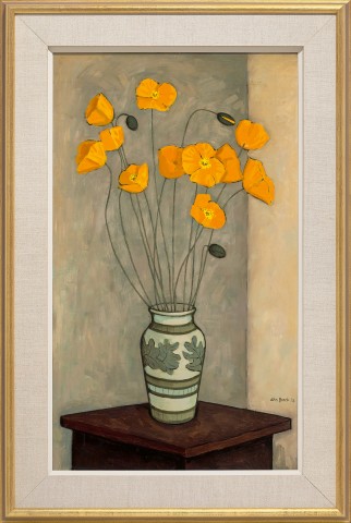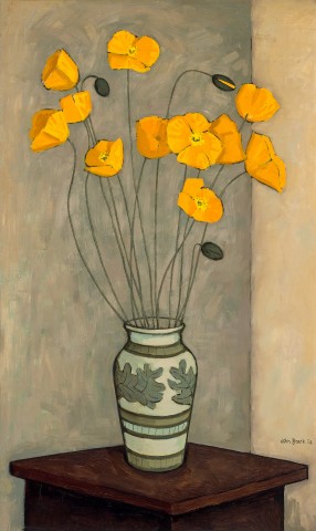 Iceland poppies, 1954 is the first of a small group of still life paintings that John Brack made during the 1950s. With the exception of three paintings of flowering gums, Brack depicted familiar, domestic cut flowers – carnations, gerberas, chrysanthemums, daisies and so on – which had long been favoured by studio artists as subject matter that is easily-accessible and infinitely varied. Described with the directness and graphic clarity that characterised Brack’s art at mid-century, these floral specimens express distinctive and sometimes anthropomorphic personalities. The stark angularity of Solandra, 1955 (National Gallery of Victoria), for example, echoes the hard-jawed women who feature in early 1950s paintings like The veil, 1952 (private collection), while his Christmas lilies, with their spidery tendrils recalling an underwater predator, appeared to a contemporary critic as having an ‘air of quiet peril.’1 By contrast, the Iceland poppies depicted here are delicate and graceful, their long fine stems bending gently under the weight of the flowers. Brack has studied the poppies closely, carefully describing the fine hairs that line the stems, as well as the subtle tonal variations between the colour of the petals and the stamen. Like a botanical artist who documents the various stages of a plant’s growth, Brack shows us fully enclosed poppy heads and another which is just beginning to open among this joyous bunch of golden-hued flowers.