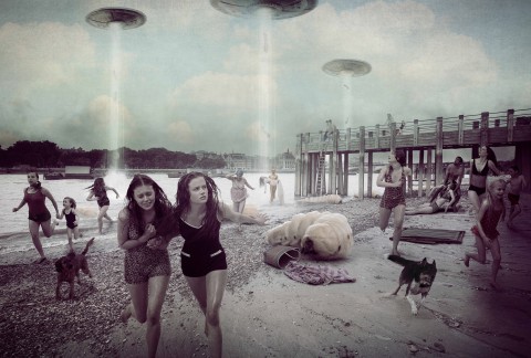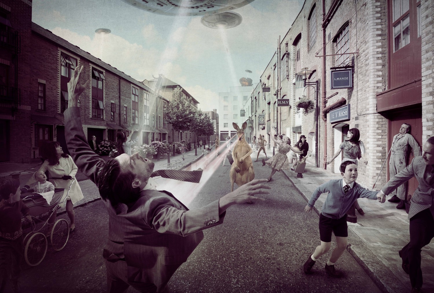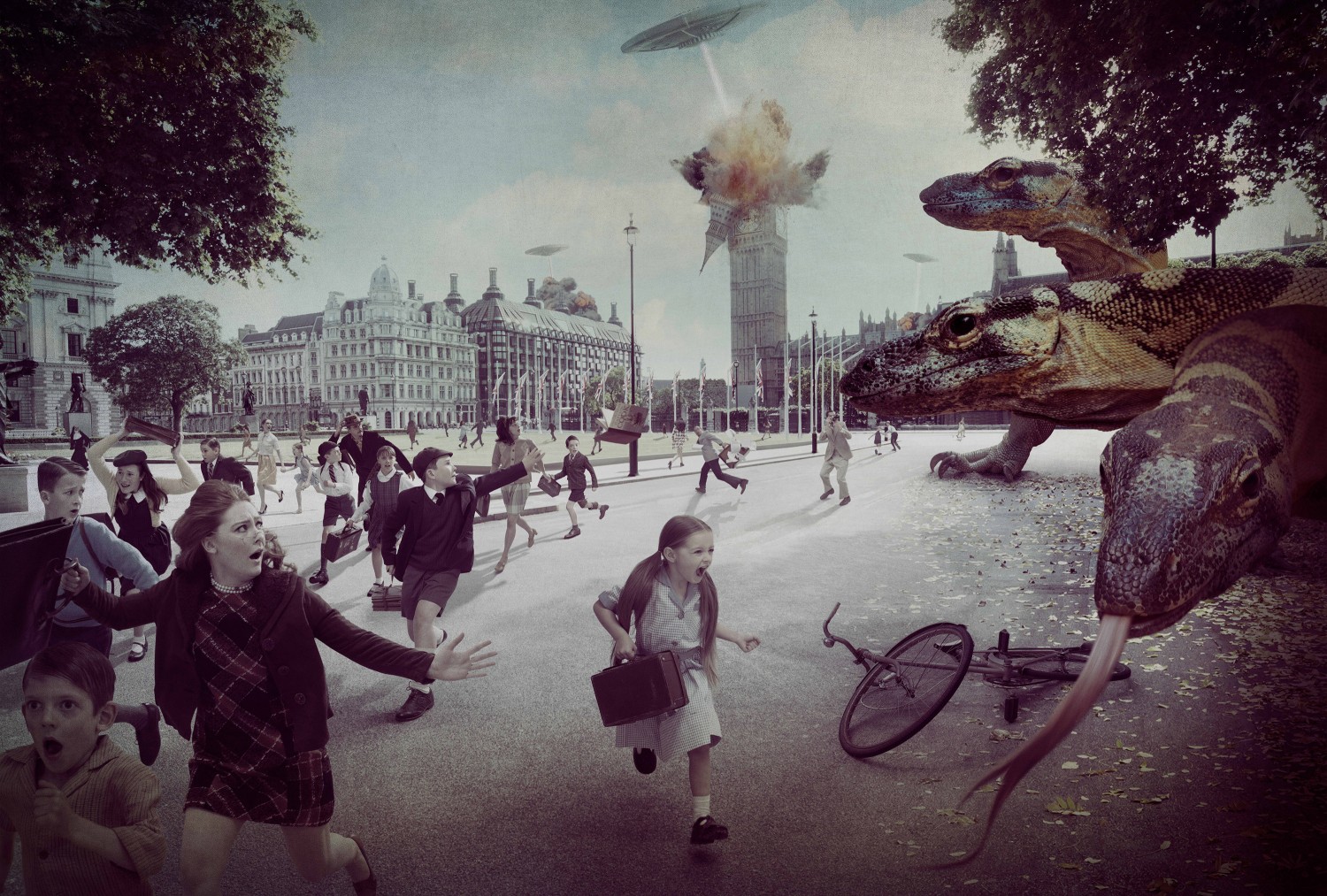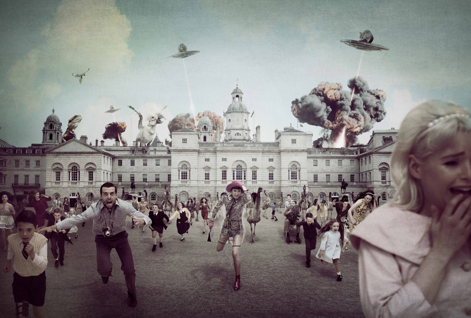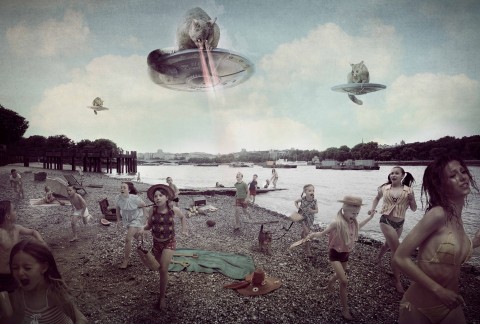 Cook’s photomontages present a pastiche of grainy textures and unsophisticated special effects inspired by B-grade sci-fi movies. Cut-out flying saucers hover in Cook’s grey English sky, carrying large possums, or depositing the various invaders on shore with luminescent tractor-beams. Laser-beams shot from the bellies of these spaceships create massive explosions on land, clouds of smoke and fire emanating from the roofs of Big Ben and Somerset House, mimicking the action-movie trope of an explosive Armageddon finale and uncomfortably evoking the ‘Blitz’. While the artist has explained that the kernel of inspiration came from Alfred Hitchcock’s seminal 1963 film, The Birds, and initially intended to include swarms of birds in every frame, the popular culture references and the strong relationships they have to real-life historical events can be traced to much earlier foundational texts.2