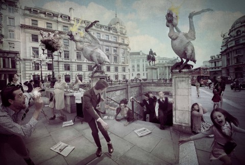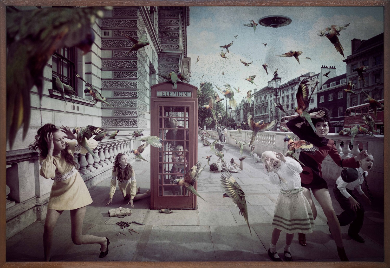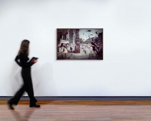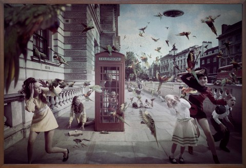 With a characteristically post-modern practice, Cook is a bricoleur (to use French anthropologist Claude Levi-Strauss’ term), taking inspiration and techniques from diverse sources, and applying them to a composite visual representation of cultural collision and intertwined histories. Replicating the terror of colonial ‘first contact’, Invasion is set in iconic locations around the city of London – the heart of the British Empire – and presents dramatic scenes of a sudden, violent arrival of aliens taking the form of oversized Australian fauna (lorikeets and cockatoos, possums, lizards, and witchetty grubs) and bronzed cyborg warriors. This invasion disrupts the everyday life of London residents, who, dressed in period 1960s fashions, appear within the still photographs thrown into silent states of melodramatic panic. At the time, Invasion was Cook’s most ambitious project to date, the technically complex series requiring eight months of production, shot on location in London and requiring a cast of fifty actors.