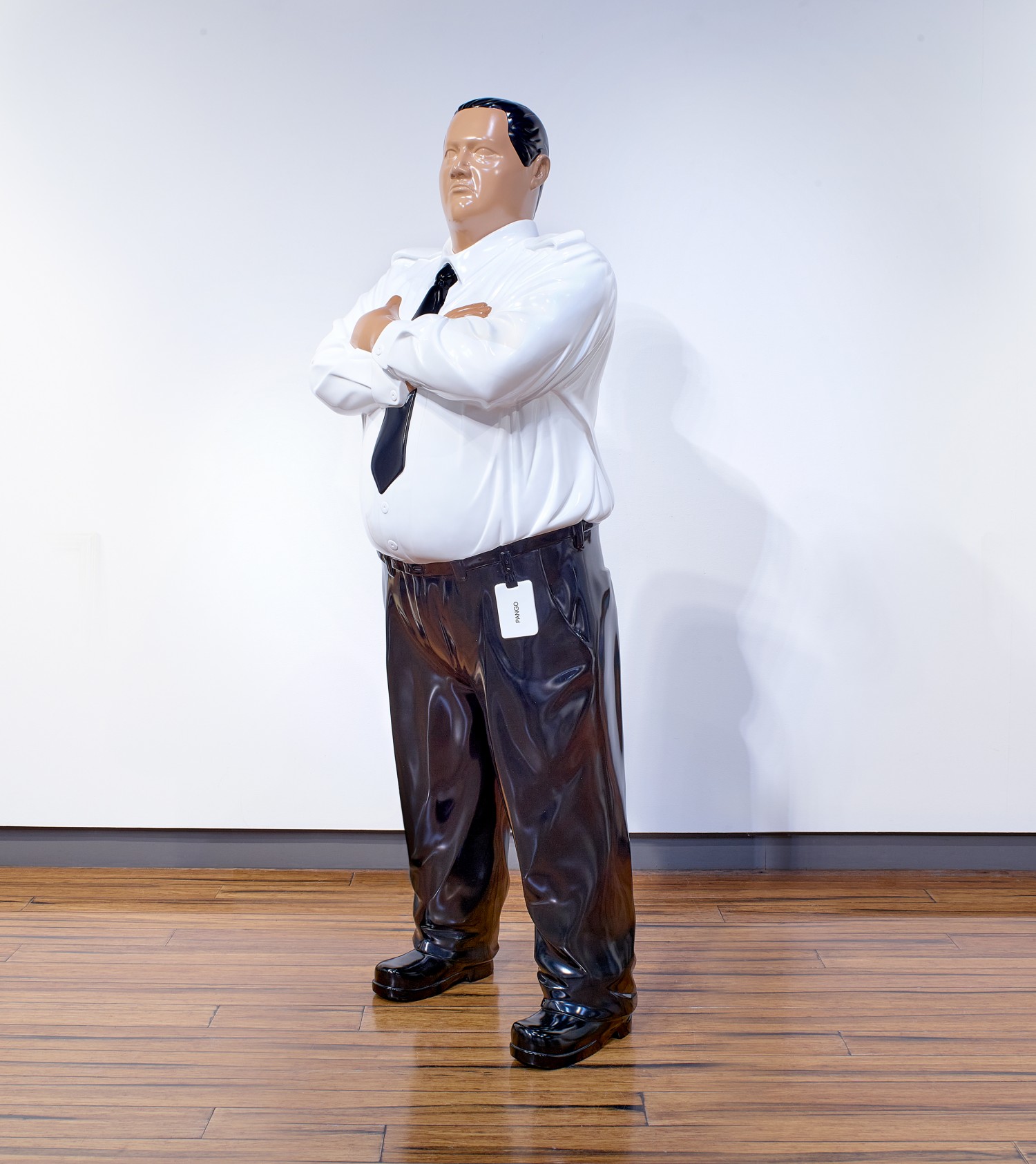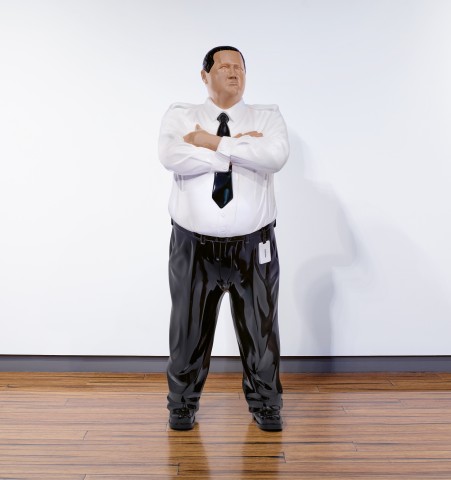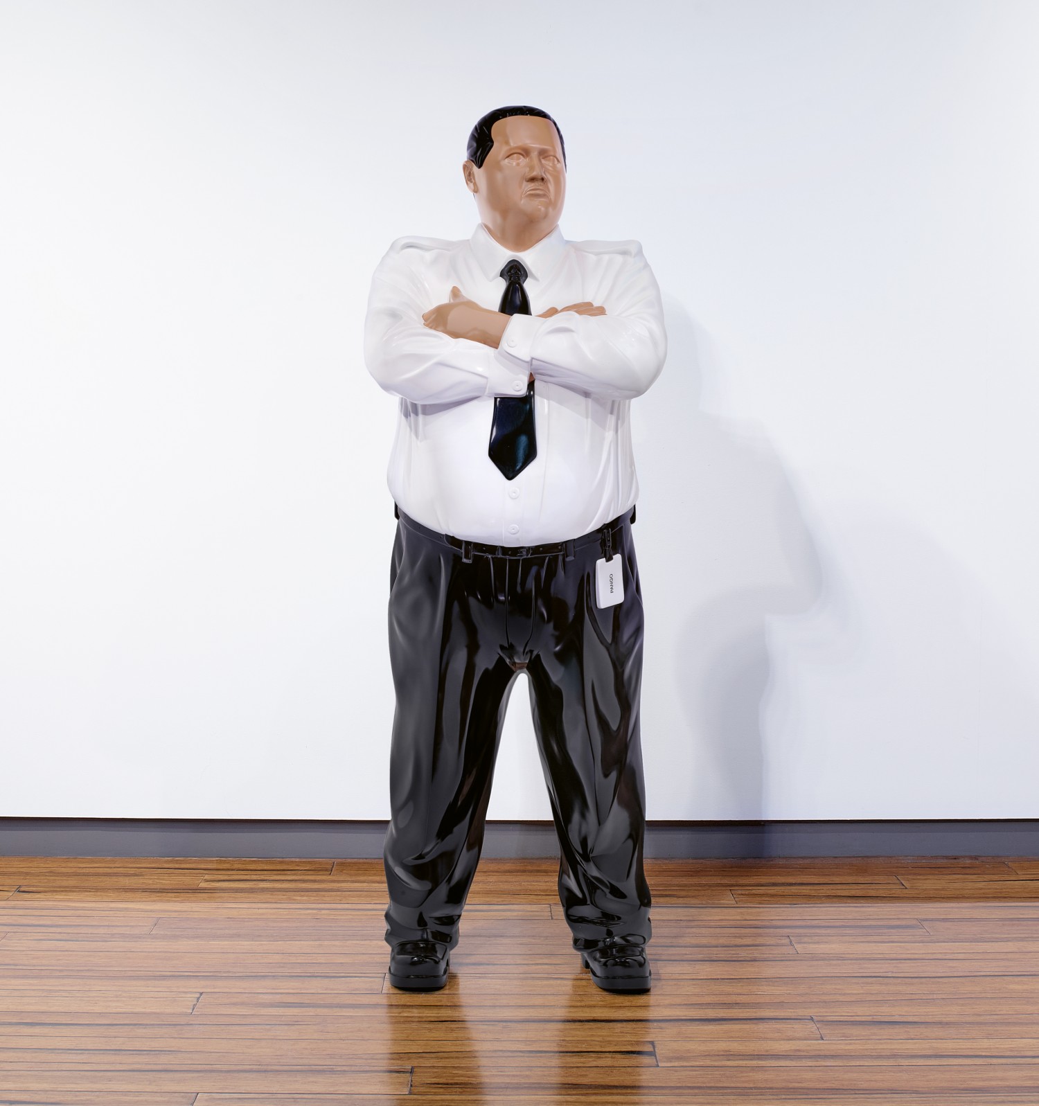Created during a period of contemporary revival of Māori tikanga and matauranga (customs, laws and traditional knowledge), Michael Parekōwhai’s security guard is a subtle reminder of the quiet and steadfast presence of Indigenous peoples in New Zealand. Kapa Haka (Pango) is one of fifteen figures, a full rugby team, each with an identical physical morphology that the artist gently mocks: big bellied, arms crossed over a barrel chest, the white shirts of their uniform straining against paunches and ill-fitting trousers gathering at their ankles. While their facial features are smoothed and airbrushed to the point of anonymity, Parekōwhai’s figures were modelled on the artist’s elder brother, Paratere, who works in the security business. Each figure is named for a colour, ‘like the gangsters in Reservoir Dogs’, their names inscribed in te reo Māori on the access cards hanging from their belts.1 ‘Pango’ refers to black or a dark colour, and is famously featured in the All Black’s haka Kapa o Pango ‘the Team in Black’. Although grounded in the economic reality of the prevalence of Māori and Pasifika peoples employed in low-paid service positions, Parekōwhai subtly restores cultural dignity to their disenfranchisement, applying the collective title of Kapa Haka to the group – the te reo Māori term for performing arts. With a hint of irony, with this title Parekōwhai equates the guards’ solid stance into that of a fearsome haka performance, uniting these individual figures in the camaraderie of the collective activity.
