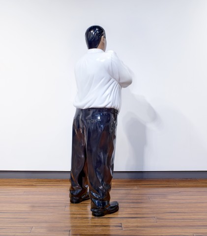 Standing guard and surveying the audience with a blank face, Michael Parekōwhai’s lifesize Māori bouncer, while instantly recognisable, maintains a slippery and elusive identity. New Zealand sculptor of Ngāti Whakarongo, Ngā Ariki and Pakeha (European) descent, Parekōwhai places intriguing solitary objects as polished and open-ended intrusions into the art and performance space, carrying with them playful and critically incisive allusions to underlying issues in New Zealand |Aotearoa’s postcolonial reality. Kapa Haka (Pango), 2003 fashioned of fiberglass and lustrously painted with the artist’s signature two-pot polyurethane finish, leans into and subtly subverts racial, social and economic stereotypes affecting Pacific peoples in contemporary society.