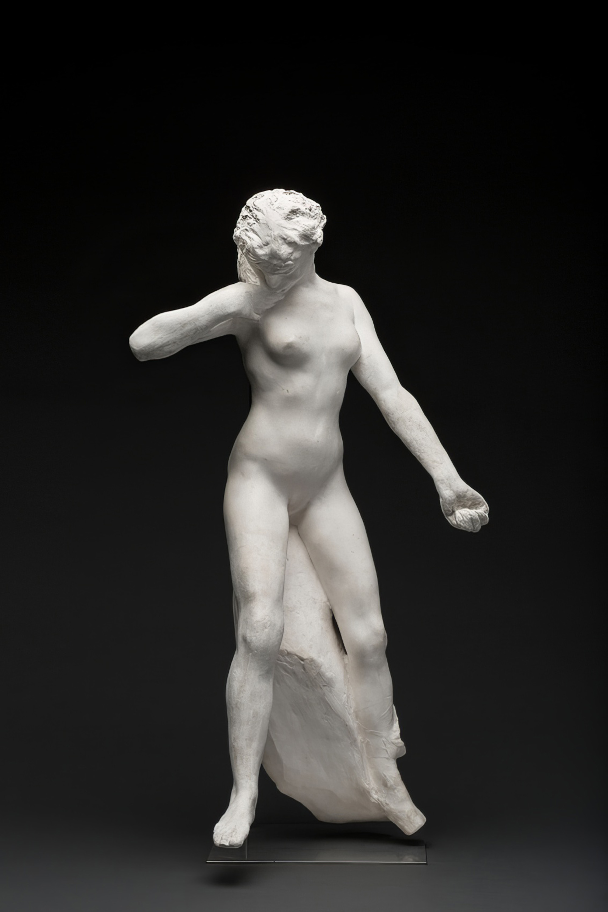 La faunesse debout, a female mythological creature, had been a semi freestanding projection in high relief in the far right of the gate’s tympanum. Rodin generated a series of faunesses in various poses from this same section, in plaster (posthumously editioned in bronze), and later also carving larger marble sculptures of the motif. A fragment of the monumental whole, here the fauness is transferred into an independent context, as an intimate figure study based in a non-Christian past.3 Although some of these figures were truncated as a result of their extraction, La faunesse debout remained intact and formally complete. Rodin kept many of these figures in small sizes, to dispel rumours that his expressive and lifelike forms had been moulded from nature.4