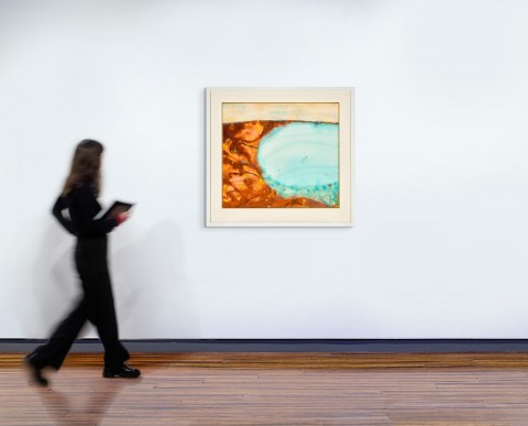 Like the artist Ian Fairweather, whom he greatly admired, Olsen was fascinated by Chinese art and literature, and found in the vast expanse of the lake a strong association with Sung Dynasty painting and the importance of space. Thus, in Lake Eyre, c.1996 he presents a perfect encapsulation of his artistic predecessors’ interpretation of the void as evoking the concept of ‘everything and nothingness’, ‘a place for contemplation, a vast, engulfing space.’4 Set on a highly tilted plane that may be viewed on a macro – and micro – level, the work captures that characteristic Olsen informality with the off-centre placement of the lake – a compositional device featured in many of his most iconic works, including Dark void, 1976 (formerly in the collection of the National Australia Bank) and Bathurst butter, 1999 (private collection) which Olsen presented as a gift to his wife at the time, Katherine Howard, on their tenth wedding anniversary.