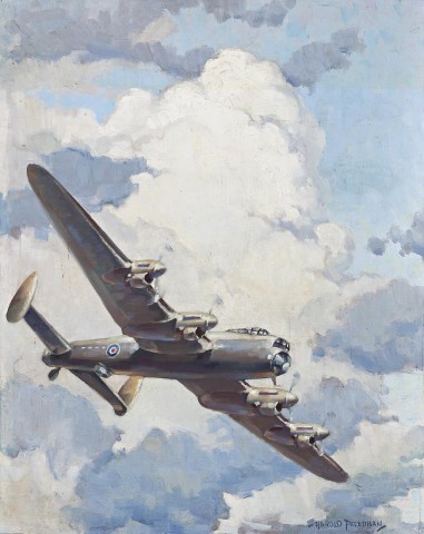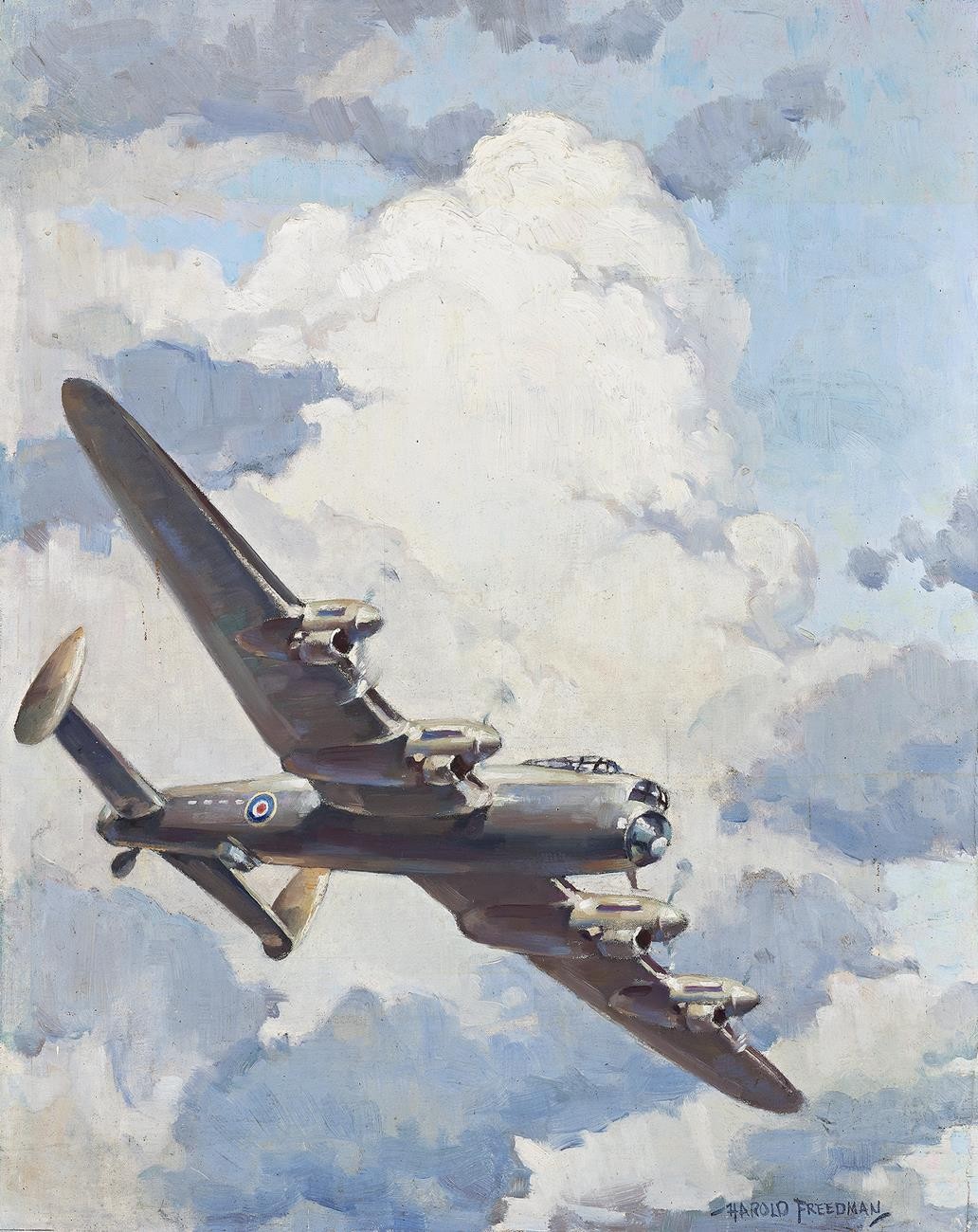 bears inscription verso: PAGE 48 RAAF LOG / AWM / 27681 / LANCASTER IN FLIGHT / by H FREEDMAN