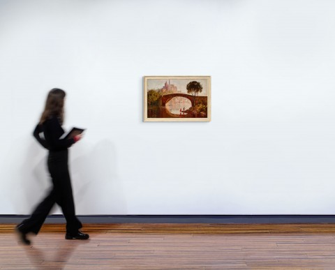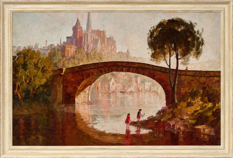 Although the cathedral in Lennox Bridge is imaginary, it finds its genesis within a mixture of sources. The tall spire, for example, may acknowledge Chartres, but its lower battlement echoes Notre Dame, while Rees’ use of red oxide for the smaller tower suggests the brickwork of the Italian campanile (bell towers) from the Renaissance. The scatter of houses and moorings at the base could even come from Polperro in Cornwall. The foreground, however, remains firmly antipodean and the total effect is akin to one of Claude Lorrain’s ‘three-step’ landscapes. When exhibited as The riverbank in 1926, a review spoke of how ‘the architectural forms in the distance – particularly in the upper right – dissolve into soft light nothingness, supporting the reviewer’s observation that the background is “so high in tone, that they may be there or not.”’4