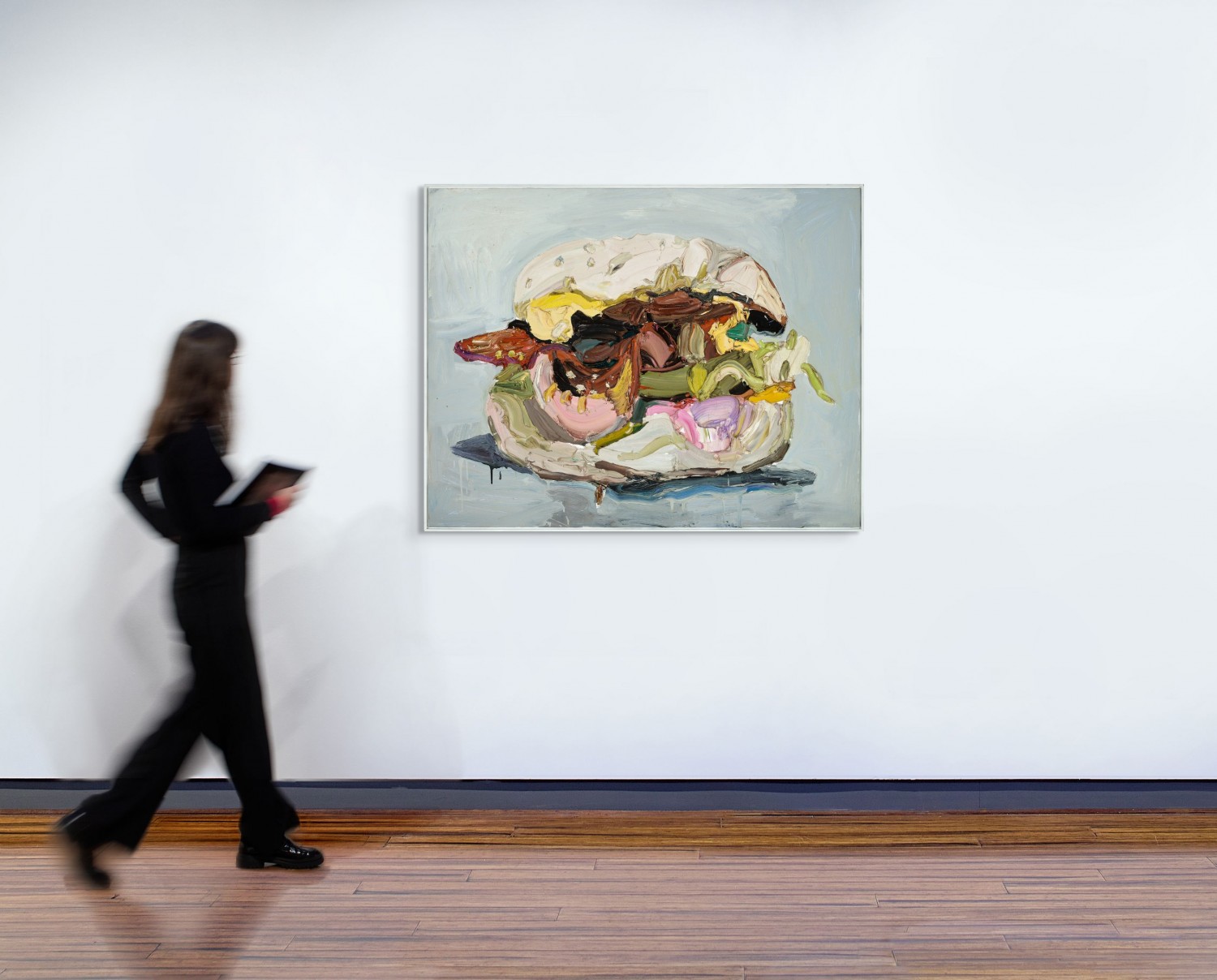 Painted quickly with cake decorating implements, in emphatic swathes of heavy impasto, Quilty’s painting becomes more than the faithful representation of subject matter. Instead, it tends toward becoming the subject itself, recreating the viscous contents of a burger sliding from the crusty bun top, and collapsing across the canvas. No wonder the Art Gallery of South Australia chose to hang their version above the Art Gallery Food + Wine foyer during Quilty’s 2019 retrospective exhibition, in a cheeky exploitation of hungry audiences!