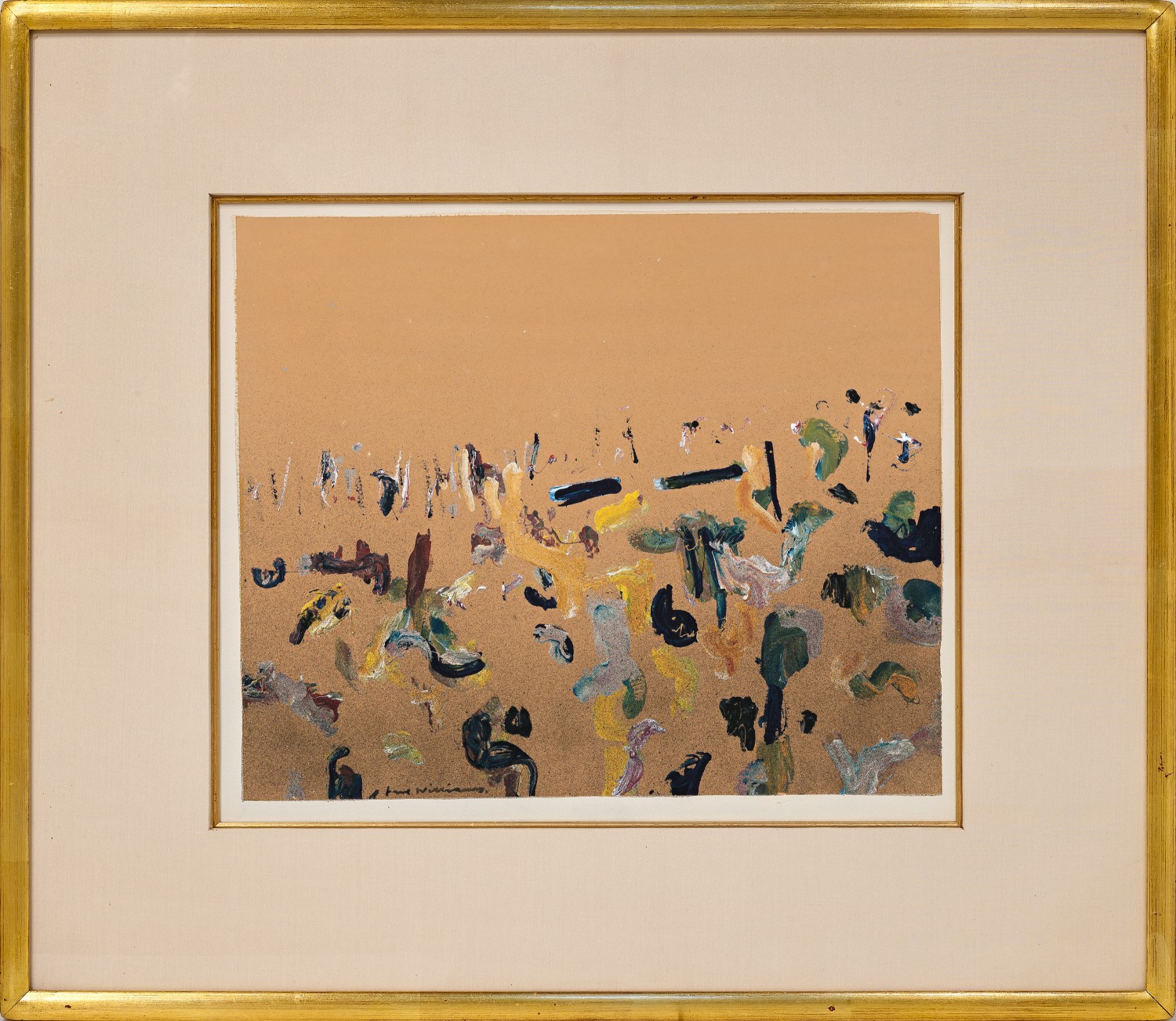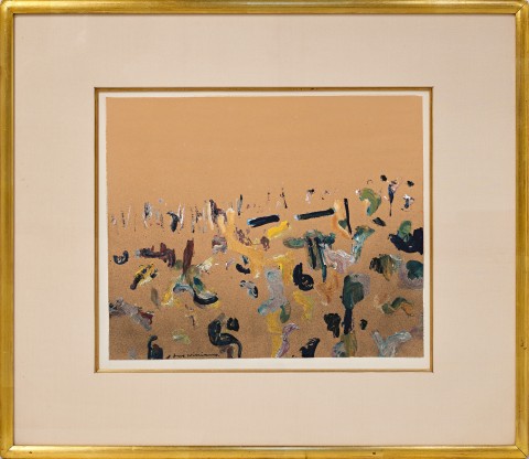 Inching towards a more reductive expression of the landscape, Fred Williams’ Lysterfield landscape, painted in gouache on paper, presents an airy and balanced minimalism, a quality in his works of the period that appeared to critics at the time ‘almost Chinese in [the] mixture of immediate gesture, spontaneous notation, with contemplation and serenity.’2 Here, Williams continues to rework the motif of the hillside which had already captivated his attention for many years, explored in various proportions, degrees of precipitous incline and elaborations of brushstrokes. Against a flat and monochrome golden ochre ground, Williams has removed all tonal variation between land and sky, together with the clear horizon line that had previously characterised his Hillside compositions. Williams’ gently sloping incline, its distant edges implied through a differentiation of painted touches, unevenly bisects the sheet of paper, providing animation to his simple composition.