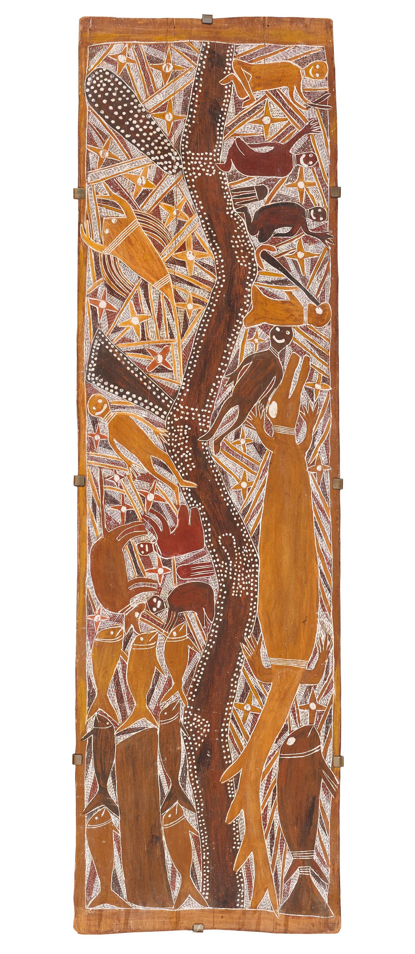Milŋiyawuy; The Milky Way, pre. 1966, natural earth pigments on eucalyptus bark, 92.0 x 35.5 cm, Kluge-Ruhe Aboriginal Art Collection at the University of Virginia, USA, illus. in: Wanambi, W., Skerritt H., and McDonald, K., (eds.), Madayin: Eight Decades of Aboriginal Australian Bark Painting from Yirrkala, Kluge-Ruhe Aboriginal Art Collection of the University of Virginia and DelMonico books, Virginia and New York, 2022, p. 171