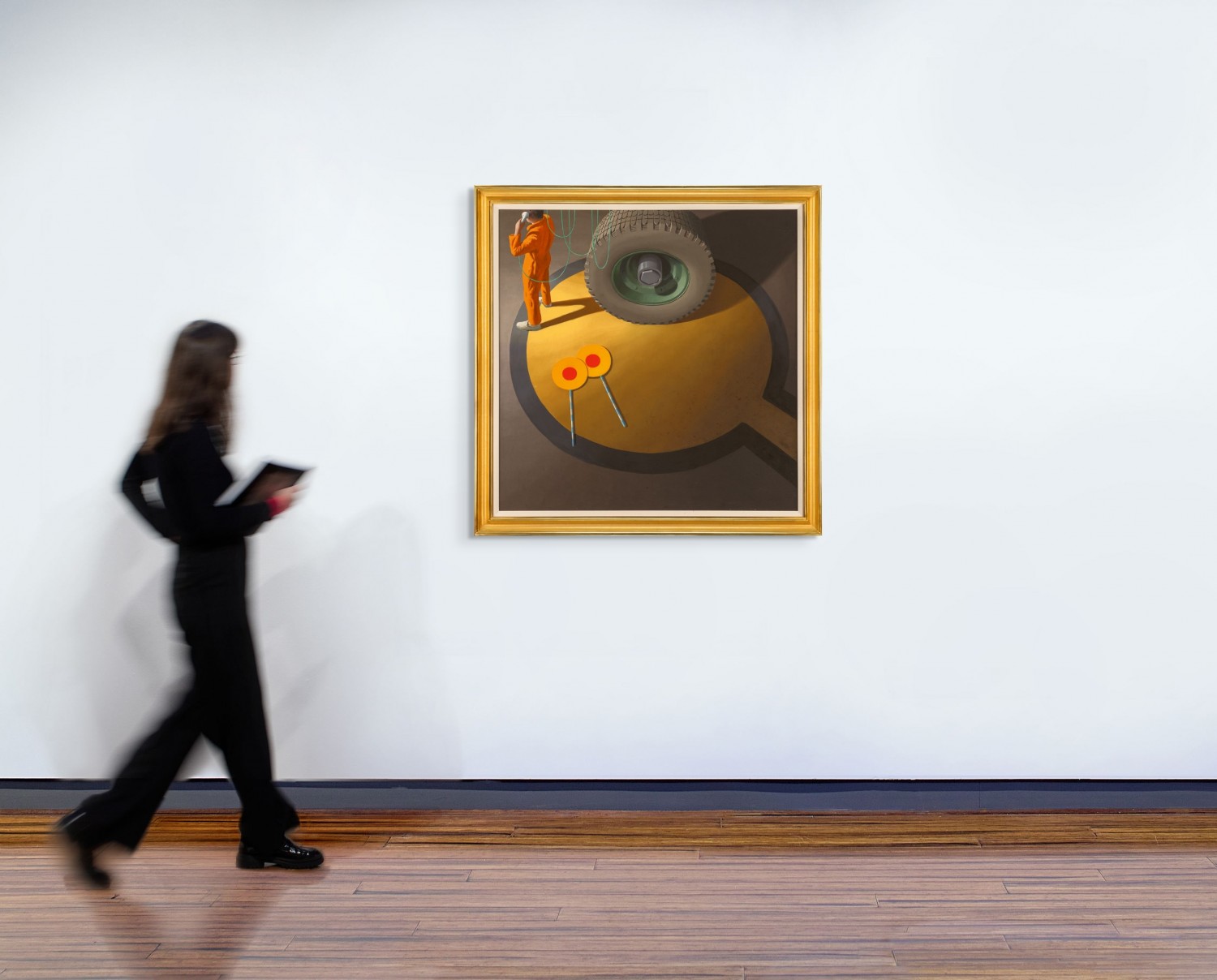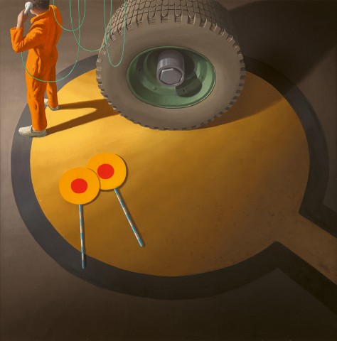 The patterned tread of the rubber tyre, provided for Smart, ‘an interesting decorative element’, justifying his meticulous level of detail. Perhaps unsurprisingly, Smart later revealed his substitution of a truck wheel, a more available form with which he had already become conversant.5 By isolating this distressingly familiar symbol of modern activity, Smart endows it with an elevated, iconic status – its revolving functionality permanently stilled in his silent world.