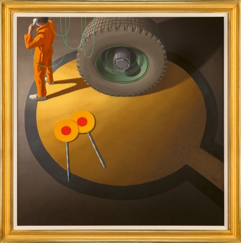 Like a freeze frame of a film, the closely cropped images of Smart’s world are loaded with a sense of intrigue, the suggestion of action existing and persisting just beyond the viewer’s line of sight. Seen from above, Night stop, Bombay presents a bird’s eye view of the tarmac of an airport runway, the larger context of air travel only obliquely referenced. Captured within the target of a yellow circle painted onto the asphalt, Smart paints a worker in bright orange overalls talking on the phone with a looping cable, his back turned to the viewer. Lovingly painted, a massive, disembodied wheel dominates the composition. The dramatic chiaroscuro of light flooding just one corner of the square canvas endows this view with a dream-like vividness. Discarded behind the worker lies a pair of hand-held lollipop markers, with distinctive blue-and-white striped handles – the arcane choreography of air marshalling long having been abandoned. In Night stop, Bombay, Smart clearly delights in the interplay of circles and directional lines, distilling them through the spatial and geometric relationships between the painted road marking, the discarded objects and the giant wheel. The vertiginous view down onto the painted tarmac from the height of an aircraft, disorientingly removes the horizon from view. This device was laboriously refined by Smart many years before in another airport painting of a solitary figure, Madrid airport, 1965 – 66 (private collection). Similar to the tarmac in Madrid airport, which is conspicuously grimy, bearing the traces of the machinery of mass transport, here in Bombay, the yellow road marking is splotched with grease, as Smart noted within his rapid in-situ sketch.