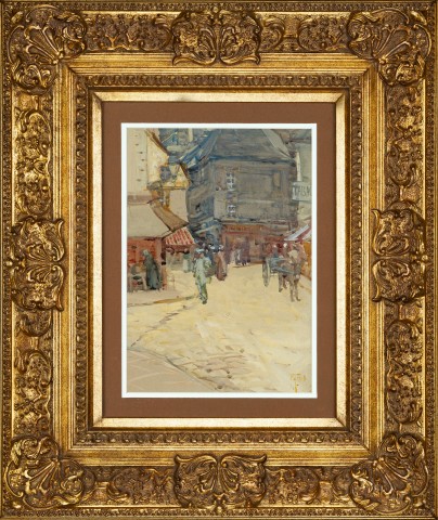The summer was plagued by constant rain, and Hodgkins was grateful for the shelter of the arcades that allowed her to overlook the local market and the comings and goings of the old medieval town. Old Street, Dinan, 1902 is an excellent example of Hodgkins’ practice at this time. The convergence of several cobbled streets that meandered through the haute ville provides an appropriate vanishing point, drawing the eye before the viewer settles on the activities taking place either side. The centre background is dominated by a dark, four storeyed building, standing in contrast to the pale awning of the shop on the left.