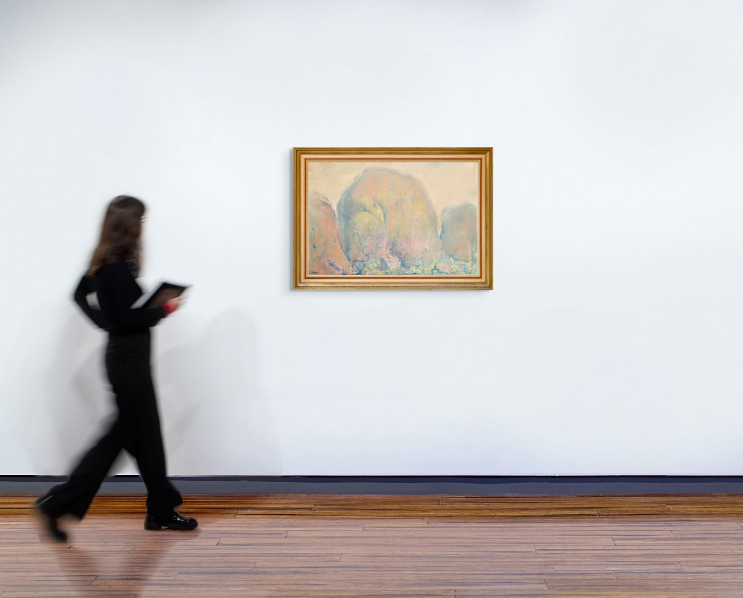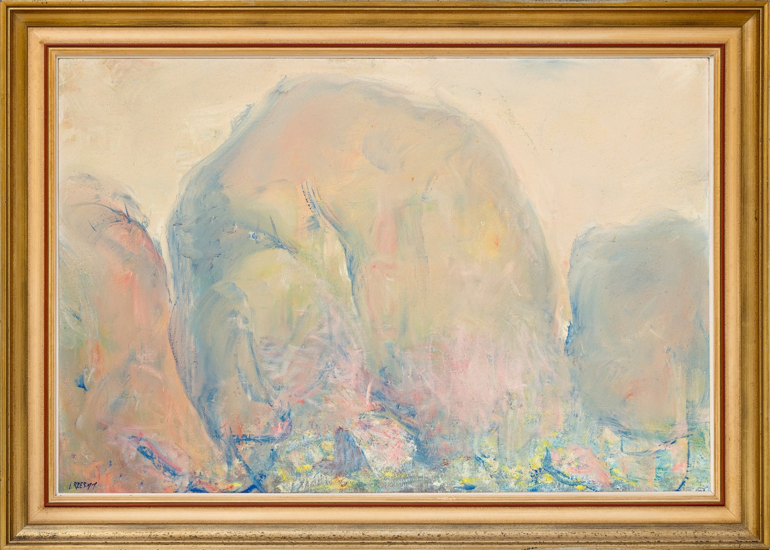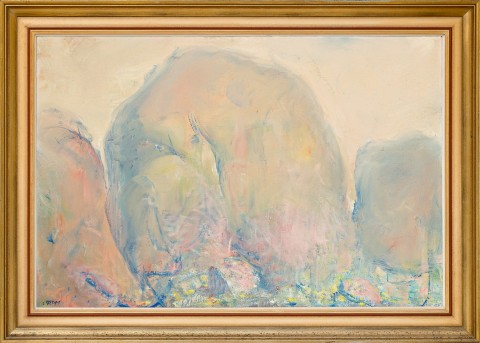 The Olgas – the dawning, 1977, was one of a sequence of canvases he painted after his return featuring the domes at differing times of day. While its companions such as Mid morning – the Olgas, 1977, (Australian National University) place as much emphasis on the expansive skies as the rock formations, in the present work the emphasis is the rounded form of the domes themselves. The painting is also a significant example of the new direction Rees had taken with his technique since 1970, where ‘everything his art had previously stood for was upended in these luminous works. Turner and Monet became his guiding lights and the evanescent, not the enduring, became his theme.’2 The Olgas – the dawning exemplifies this with the monolithic forms executed in atmospheric creams and apricot as they slowly reveal themselves in the radiance of the early morning light, whilst patches of green and pink at their base hint at the hardy vegetation which grow between the rocks. In an article on the exhibition containing these works3, Sandra McGrath pronounced Rees to be ‘a new, mystical master at the Centre’, observing further that he had made ‘cathedrals of the rocks’4, a reference to his lifelong fascination with such buildings (see also lot 29). The sensuous, organic curves also recall paintings done of the Olgas by Rees’s great admirer Brett Whiteley in 1970, and again in 1985.