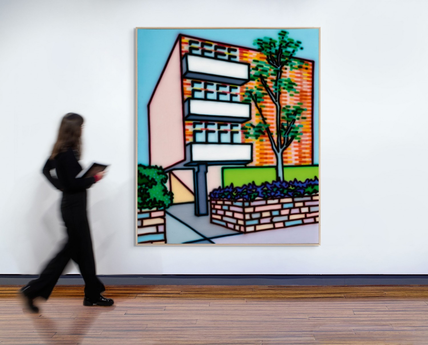 Like many of Arkley’s suburban exteriors, O.Y.O. Flats was inspired by a real estate advertisement for the sale of a ‘LIGHT AND BRIGHT’ apartment with a ‘SUNNY OUTLOOK ON LIFE’ in Rathdowne Street, North Carlton. Using the advertisement’s fine line drawing as the starting point of his painting, Arkley transposed the composition’s tight framing and somewhat lurching perspective, as well as the viewer’s vantage point from the street – filling the open white spaces of the apartment’s original ‘likeness’ with shimmering terracotta brickwork, a tessellated fence of alternating pastel hues, and large blocks of strong colour that emphasise the building’s blocky modernist form. The artist’s command of the airbrush really comes into play here, with the work’s confident black linework emphasising the block’s solidity and ‘good bones’ (to steal a real estate term), while proudly emphasising the painting’s undeniable Pop sensibility. As Arkley happily admitted, he was ‘never ever going to be a de Kooning or a John Olsen’ and he ‘was never going to love paint and wallow around in it’9: