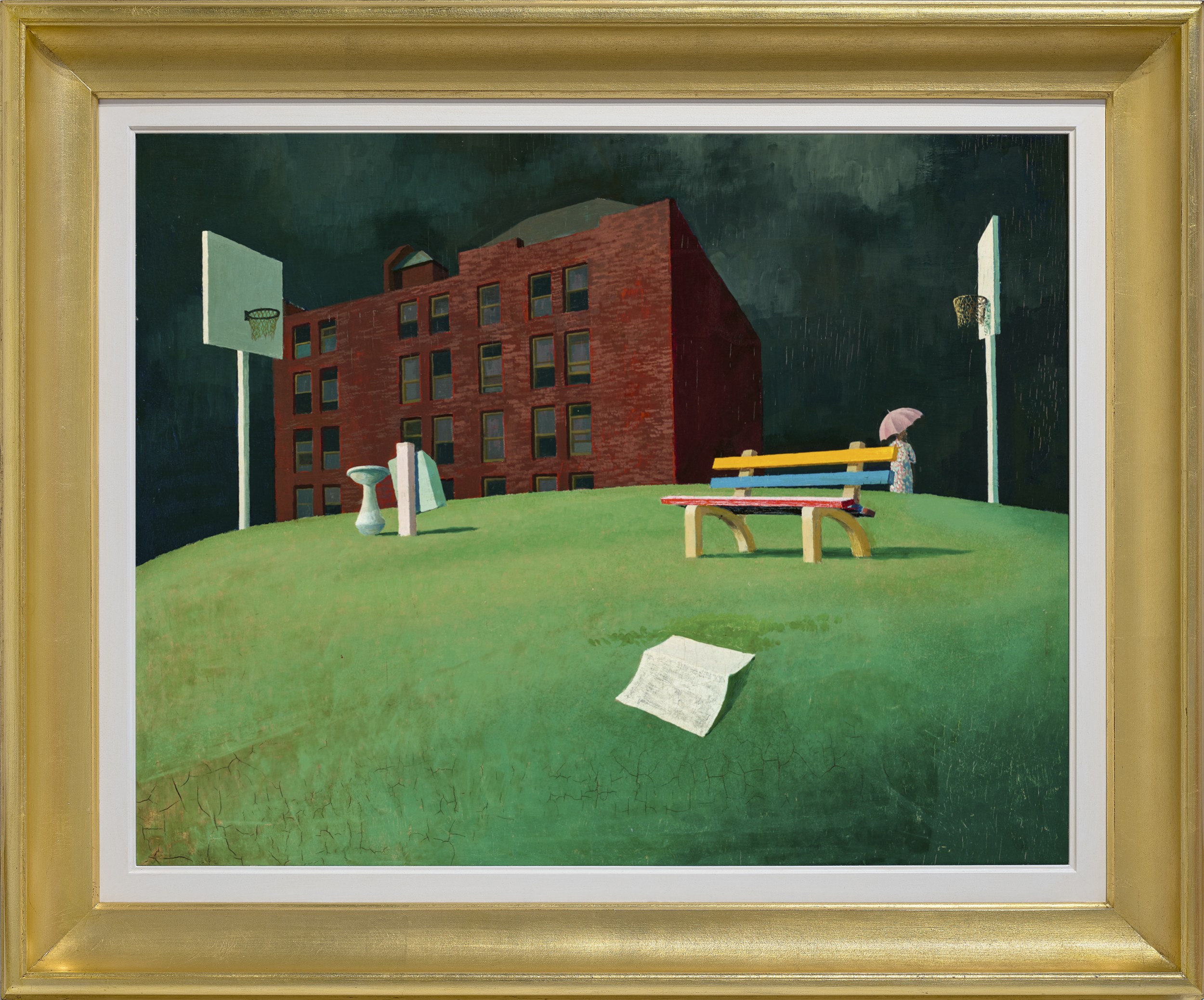 Indeed depicting an Australian landscape, if only in name, The park belongs to a key group of enigmatic paintings of Sydney parklands, including Centennial Park, 1959 and Park at Paddington, 1959 of the same year, then Beare Park, 1961; Newtown Oval, 1961; Trumper Park, 1961; Cooper Park I, 1961, and Cooper Park II, 1962. With a cinematic tenor central to Smart’s style, the surging bright green hill of The park is crowned by an array of exposed street furniture, including a slightly skewed rubbish bin, a drinking fountain and forlorn basketball hoops painted in pale tones that almost glow under Smart’s floodlight effect. A discarded newspaper is placed in the foreground beside a vacant, candy-striped park bench, suggestive of a dead-letter drop. An anonymous woman in a dappled coat is glimpsed walking off-stage, her identity further concealed by an umbrella. The motif of a multicoloured bench was repeated within the smaller Park at Paddington, also shown in the Macquarie exhibition, this time occupied by a seated man who reads the newspaper. In this larger composition, the deserted, disquieting stillness, foreboding inky black sky and shuttered presence of the building all serve to create a heightened tension, perhaps implying an atmosphere of surveillance familiar from news and popular culture in these years of escalating Cold War crises.