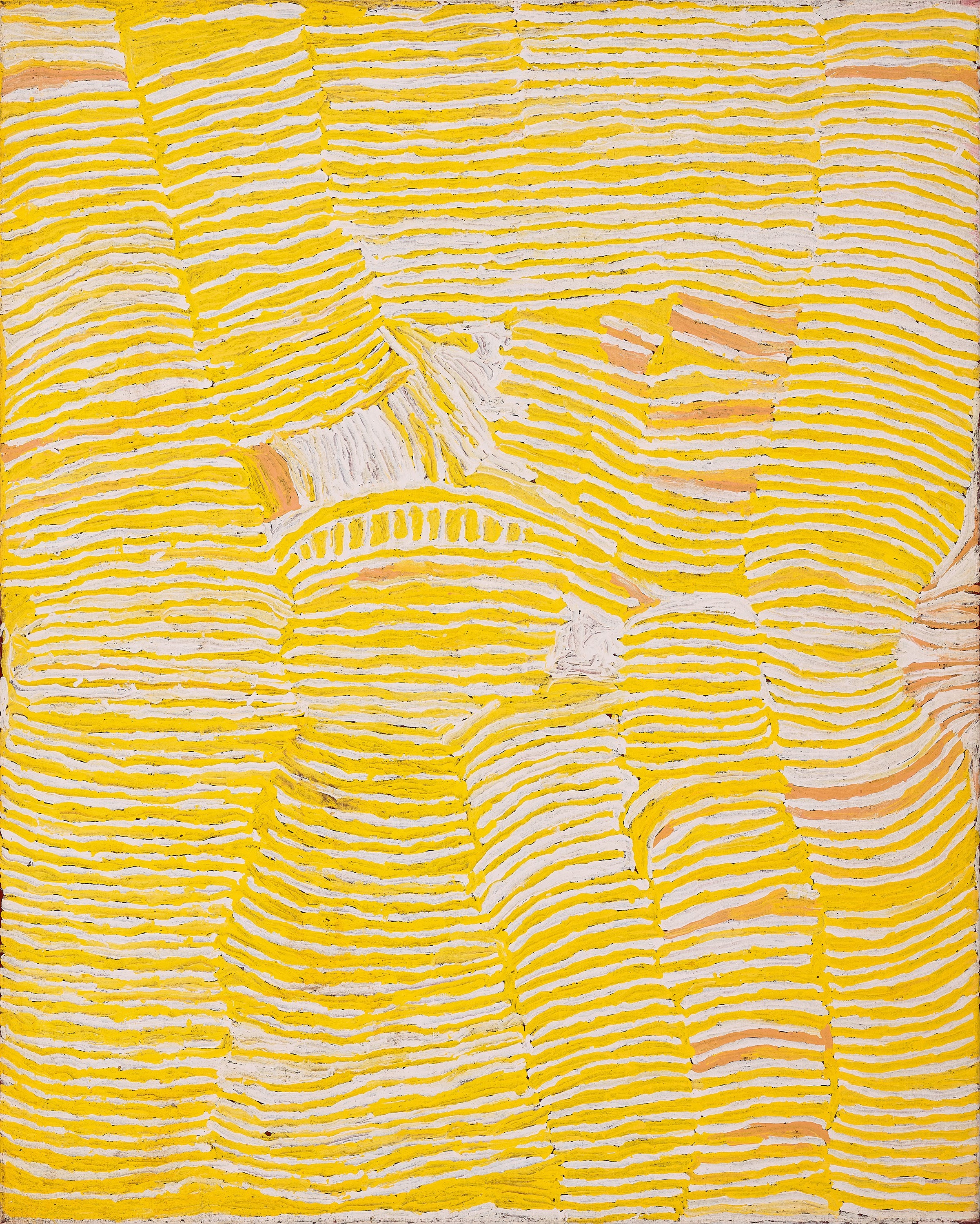 Vibrating with rhythmic free-hand striations of sunflower yellow and white, Peewee, 2002 is a mature, light-flooded work by Makinti Napanagka, painted after her vision had been restored following cataract surgery in 1999. This painting, like most in her oeuvre, refers to traditional life remembered and reestablished on country, and a sacred water source for which the artist has inherited custodianship in the temporal world. The Peewee (also known as the Magpie-lark, one of the Northern Territory’s native and protected species) is associated with an important Dreaming at the rockhole site of Lupulnga, south of the Kintore community. Lupulnga and the Peewee Tjukurrpa are one of Napangka’s principal stories, featuring often in her paintings alongside designs associated with the travels of the Kungka Kutjarra (Two Ancestral Women), who sang the land and visited the site on their way north to Kaakuratintja, Lake Macdonald. The recurring and all-over thickly painted rows of quivering lines and arcs commemorate the ceremonies at this site, particularly evoking the movement of nymparra, the hand-spun hair-string skirts worn by lead dancers, including Napanangka herself. The viscous impasto of Napanangka’s paint and its haptic texture replicate the generous application of ochre body paint in these women’s ceremonies.3