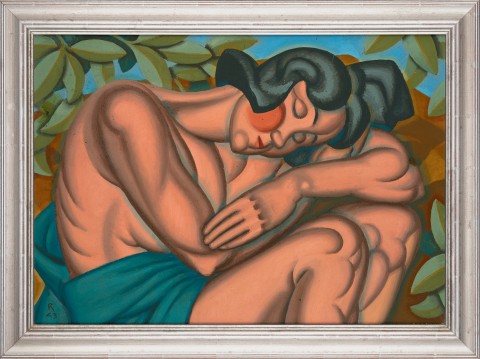 Although arguably most celebrated for his ambitious allegorical murals that conflate the trauma of the two World Wars with the existential anxieties of the Cold War, Hawkins’ oeuvre was notably diverse – also encompassing depictions of athletes, bush landscapes and scenes of modern life. Closely related to A green room (dancers resting), 1943 (Queensland Art Gallery | Gallery of Modern Art), the present Sleeper, 1943, offers a superb example of Hawkins’ intimate domestic compositions that reveal a quieter, more contemplative dimension of his practice. Beautifully rendered in softly modelled volumes and interlocking curves, here the reclining female figure conveys a profound sense of inwardness, the rhythmic geometry of her depiction underscoring both repose and latent tension, while the stylised foliage and compressed pictorial space attest to the artist’s enduring commitment to formal synthesis.