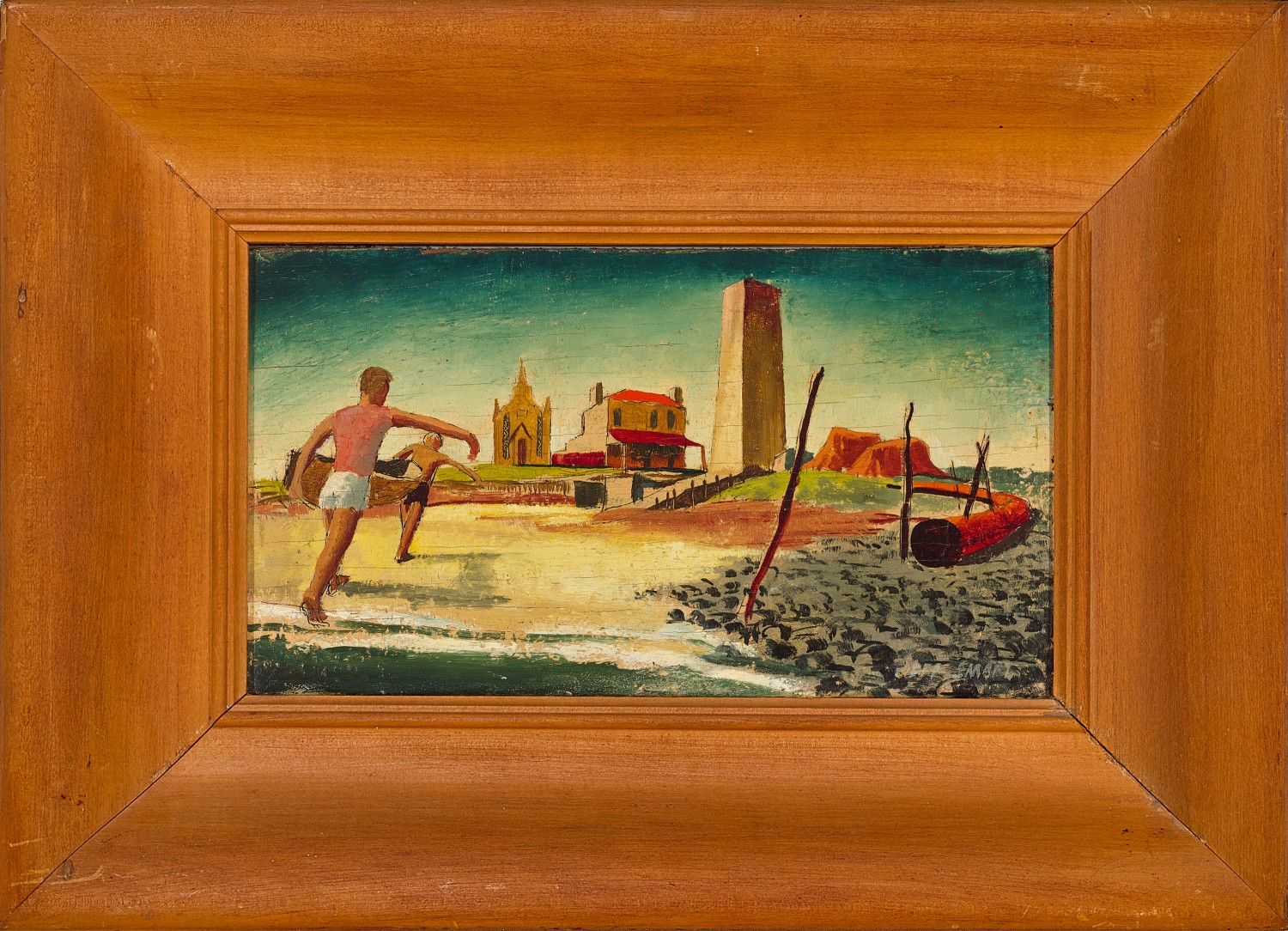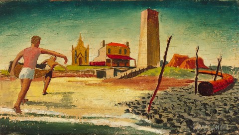 ‘Jeffrey Smart’s Wallaroo, 1951 is a painting of utmost clarity and poise. It embodies a rhythmic swing in the dynamic of two boys carrying a boat, echoed by the posts rising in the foreground and the dramatic arc of the pipeline emerging from the edge of a cluster of rocks, leading our vision around to the background. There is an insistent doubling of forms across the scene, like notes that rise and fall between the spaces of a musical composition. The slender figure stepping out of from the water’s edge holds his arm out in a balletic pose for balance. It becomes another curing line, a gesture akin to floating in air like the boat itself. The luminous beach is the open terrain into which the figures enter, moving towards architectural structures positioned like stage props in the background. The figures seem held in time; the haunting stillness gently amplified by the orb of the moon, ‘a note against a plain surface’ that inevitably adds to the romanticism of the whole conception as an evocation of being and becoming, held in equilibrium.