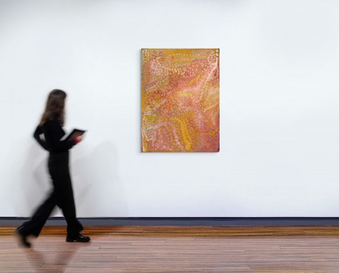 The genius of Emily Kame Kngwarreye is apparent in the way she created highly evocative paintings of great visual complexity out of deceptively simple marks with the brush. Untitled (Awelye), 1993 is painted in a varied palette of closely matched, high key tones where the overlapping brush marks create an optical density and depth that takes the eye across all parts of the canvas. The effect is to evoke the dizzying summer heat of December in the desert. Yellow, white and pink dots float in and out over a field of red, green and soft purple.
