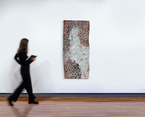 Circles, 2015, natural earth pigments on stringybark,135.0 x 77.0 cm, private collection, illus. in Scholes, L., et. al., The Moment Eternal: Nyapanyapa Yunupiŋu, Museum and Art Gallery of Northern Territory, Darwin, 2020, p. 35