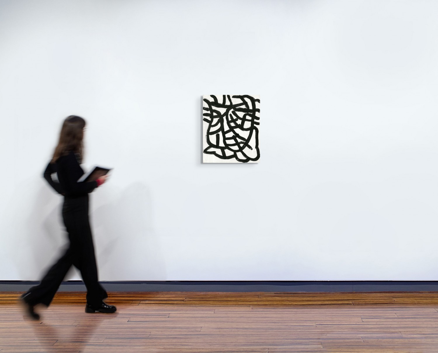 In Untitled (Yam), a single inky black tone is applied with deliberation, sweeping arcs of paint moving energetically across the modestly scaled canvas. These arcs evoke the painting’s subject: the meandering, rhizomatic roots of the Arlatyeye plant (pencil yam, Vigna lanceolata) and the fissures that appear in the earth as the yam ripens. At the same time, the gestural marks emphasise the immediacy and intimacy of the exchange between artist and canvas.