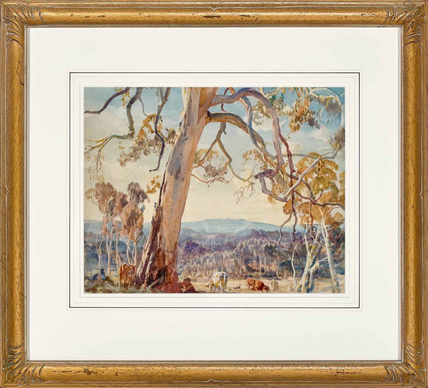 Hans Heysen’s prodigious talent was recognised early to the extent that in 1899, at the age of twenty-two, four South Australian patrons made a gift to £400 enabling him to study in Europe for four years. Upon his return, the results were immediately apparent with the Art Gallery of New South Wales purchasing The coming home, 1904, followed by Heysen’s first Wynne Prize for landscape painting that same year. He also married one of his students, Selma Bartels. In 1908, the couple (now with two daughters) moved to rented premises in Hahndorf in the Adelaide Hills. Four years later, they purchased ‘The Cedars’, a sprawling property of thirty-six acres filled with thousands of gum trees, a great number of which became central to his paintings – with the artist often returning over time to chart the changing effects of light upon them as they aged. Here he built a bespoke studio, which remains standing today as the oldest surviving example in Australia. Employing his European studies as foundation, Heysen was thus able to ‘(render) the gum tree familiar; they are like oak trees, solid, reliable citizens of the countryside.’1 The white gum, 1945, features one of these majestic trees, identified by Allan Campbell, Curator of the Heysen Collections, as being one of the artist’s ‘favoured Manna gums looking north from his property’2, here providing shade for grazing cattle, set against a background vista of scrubby forest and hills.