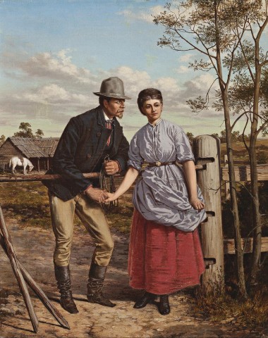 The depiction of love in the nineteenth-century took a variety of forms, the eager, sentimental and moralistic included. In Wooed and Won, 1874, Henry James Johnstone chose the genre of the bush romance, a slice of contemporary life engaging the anecdotal to the naturalism of figures and landscape. Bathed in the sunny light of Australian optimism, the country gallant woos his maiden fair. Bending ever so slightly, his earnest endeavour is profiled with intent. Right hands link in hope. His left grips a whip, with his still saddled, earlier love, relegated to the background. Rich in metaphors, only one slip rail remains to separate the couple. To the right, branches of two young trees entwine. When shown in the annual exhibition of Victorian Academy of Arts, Melbourne, in October 1874, the reviewer for The Argus declared it: ‘noteworthy on account of the Flemish finish of the drapery, and the ability with which the artist has contrived to make both the persons who figure in this rustic idyll tell the story’.1