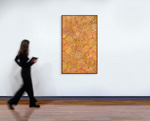 Stylistically, Yam country, 1993 echoes a number of remarkable earlier paintings executed in 1990 and 1991. Notably, it was created in January of 1993, during a summer which was memorable for below-average rainfall and shortage of water across the country – with the drought felt particularly keenly in the Simpson Desert and Central Australia regions including at Utopia, a land characterised as a broad, flat area of desert covered by windswept sand hills and little vegetation. Offering a bright, joyous celebration of this land’s resilience, Yam country focuses upon the imminent burgeoning of the yam seed, the bush potato from which Kngwarreye derived her name. The underlying graphic matrix of meandering lines mirrors the subject – the rhizomatic roots of the Anwerlarr (the pencil yam, Vigna lanceolata) – painted here in bold red lines and semi-covered by superimposed dotting and broad stippled blotches that systematically weave across the surface of the painting. Occupying a unique transitionary place in the development of Kngwarreye’s technique with disparate compositional and stylistic devices coexisting on the one canvas, indeed the work represents an apt symbolic expression of the swift seasonal changes about to animate the desert landscape of the artist’s country.